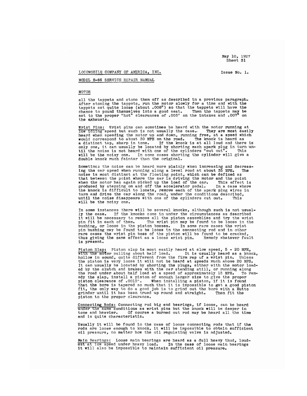 "1924-1927 Locomobile Service Repair Manual Model 8-66"