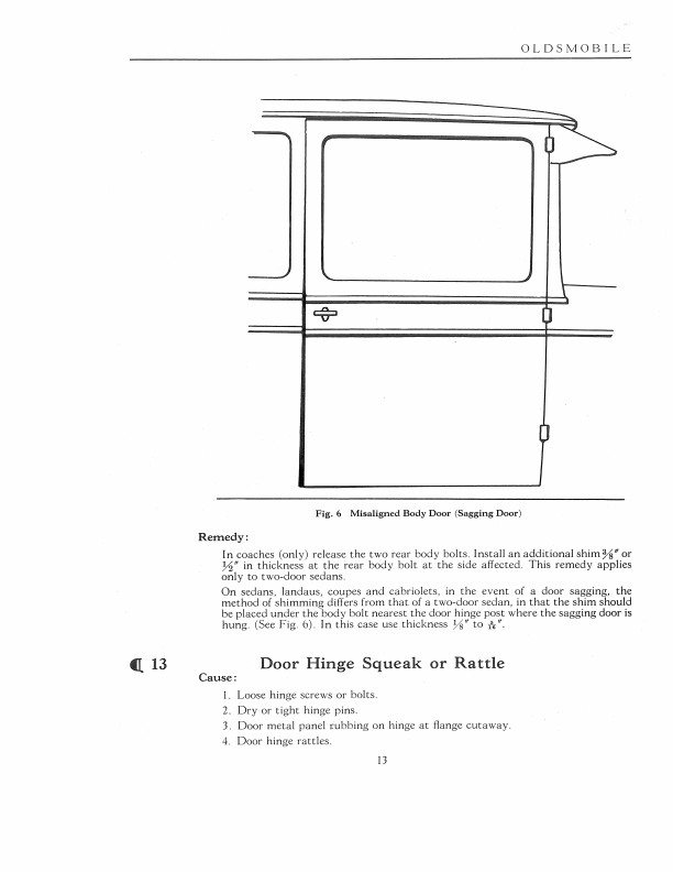 This is a reproduction of the manual written by GM for use at Oldsmobile dealers. Find out how to work on the body of your Oldsmobile with repair instructions which are different from what you will find in your shop manual. The book is packed with illustrations of the cars. You will find illustrations showing the body's construction, including the wood frame and metal pieces, along with part names. Find out how to remove, install, and work on glass, window regulators, top material, shroud belt moulding, and even how to remove and install the whole body. Learn to troubleshoot squeaks and leaks and to make adjustments to bolts and shims, door alignment, window regulators, glass, and hood alignment. The book is in NEW condition. Buy now to own the most specific body manual for your car.