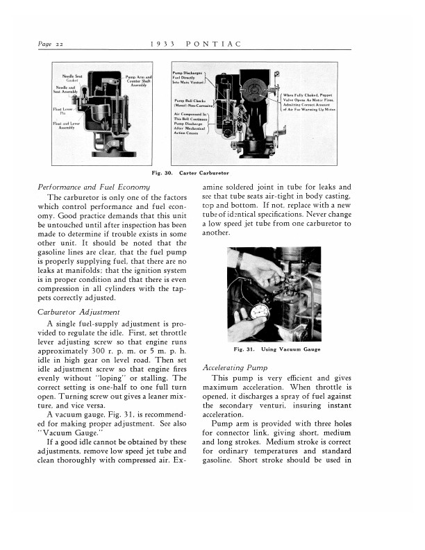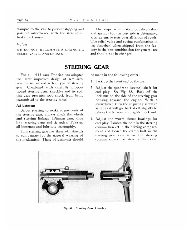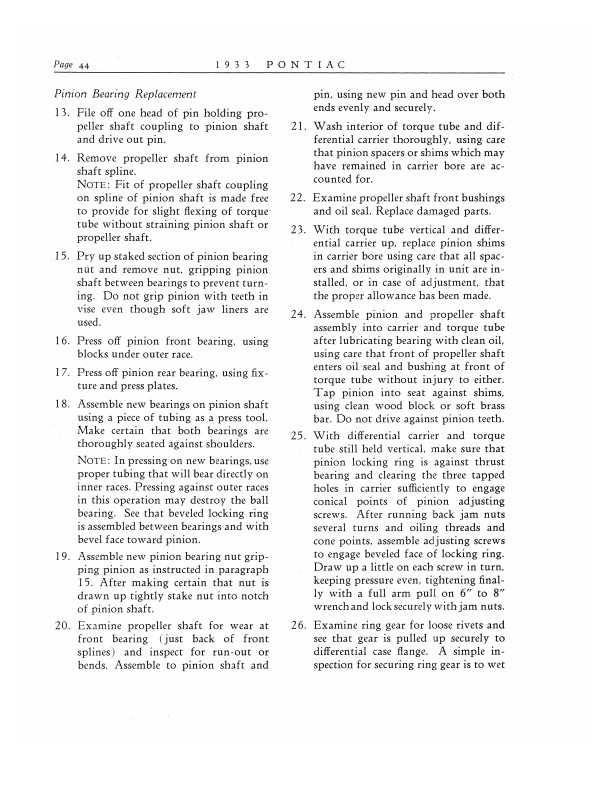 "Shop Manual 1933" Written for Pontiac dealership mechanics, this page for page reproduction of the factory-published original manual shows you how to work on your vehicle. In this book, you will find information on engine repair, syncro-mesh transmission, rear axle, brakes, wheels and tires, frame, steering, electrical system, and body. This manual includes a lubrication chart for the chassis. With step-by-step instructions, clear pictures, exploded view illustrations, wiring diagrams, schematics, and specifications, you will have the information you need to get your project on the road and keep it there. This manual covers all 1933 Pontiac models including, Roadster, Sport, Convertible, & Standard. This book has 107 pages, measures 8.5" x 11" Buy now to own the best manual for your vehicle.