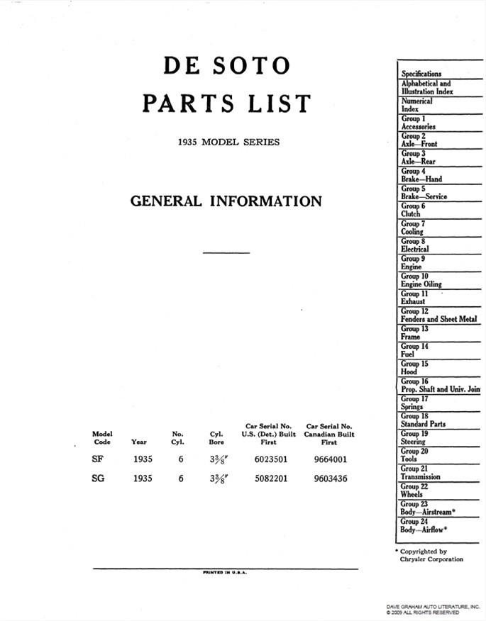- the 168 page "De Soto Parts List 1935 Model Series Issued July 1, 1935 (Supersedes Issue of February 15, 1935)",