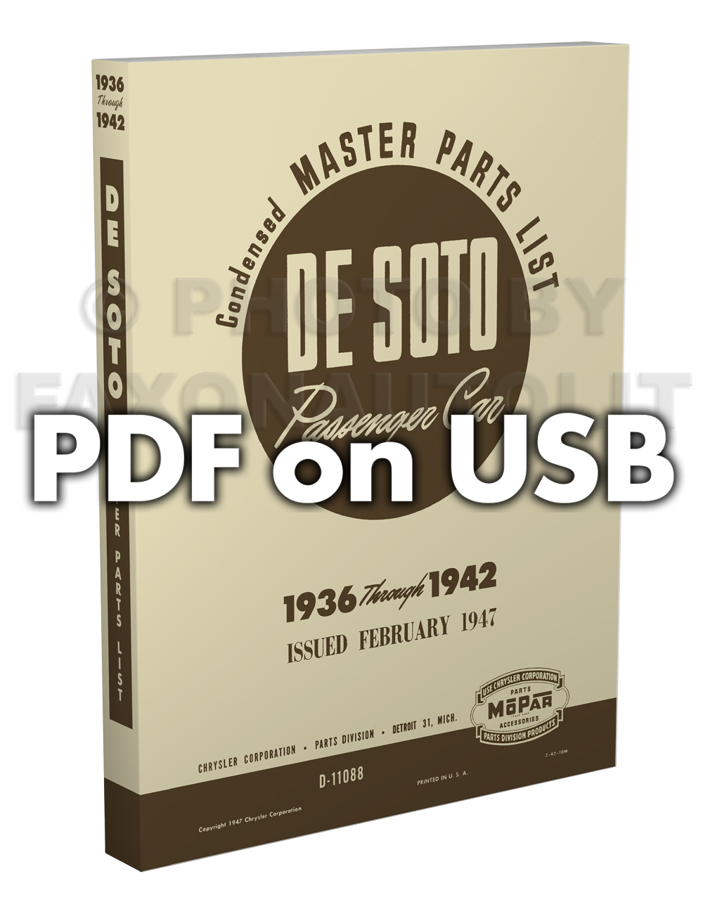 You will find original parts numbers, which are still useful today because most parts vendors still use those numbers to keep track of their own stock. You will also find some illustrations, though not for every part (few body parts are illustrated). Covers axle, brakes, clutch, cooling, electrical, engine, exhaust, fenders, sheet metal, frame, fuel, hood, propeller shaft, universal joints, springs, standard parts (nuts & bolts), steering, tools, transmission, wheels, and body. Parts books are the authority on the correct equipment for your vehicle; you'll know definitively which parts and accessories are original when you use this USB . You can use the information on this USB to restore all 1935 through 1942 De Sotos. Buy now to own this parts book on USB . We have manuals on paper also -- see our other items.