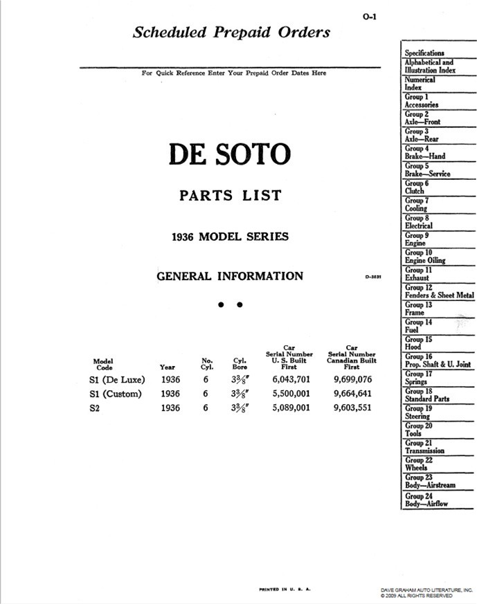 - the 188 page "De Soto Parts List 1936 Model Series Issued July 10, 1936 (Supersedes Issue of December 5, 1935)",