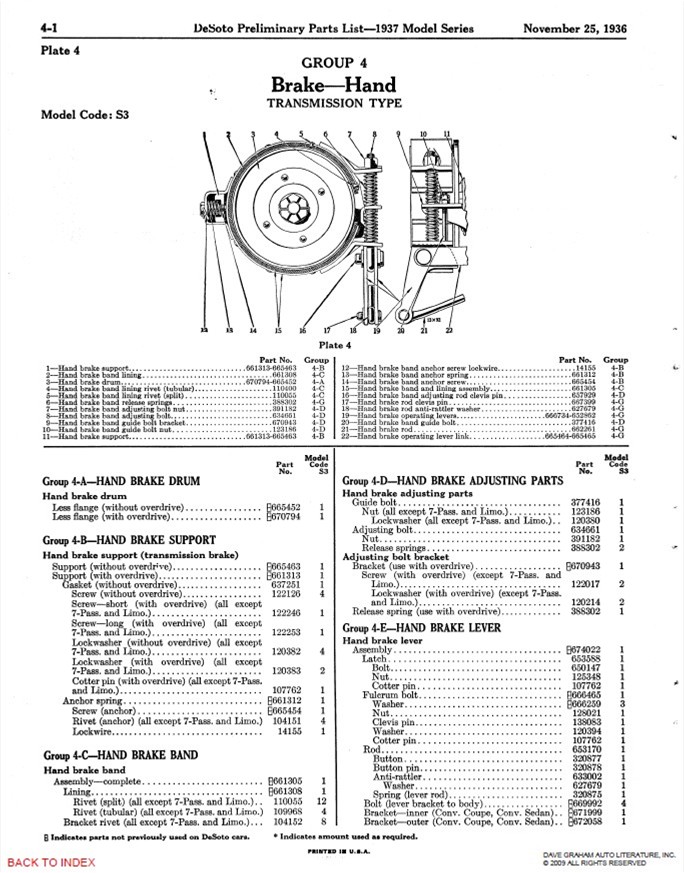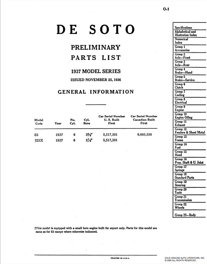 - the 102 page "De Soto Preliminary Parts List 1937 Model Series Issued November 25, 1936",