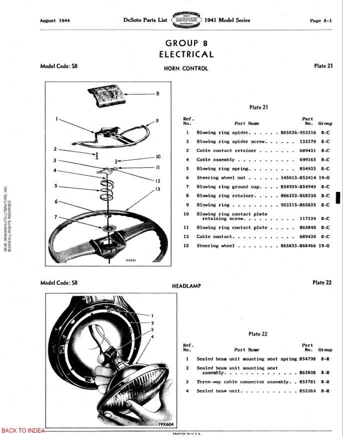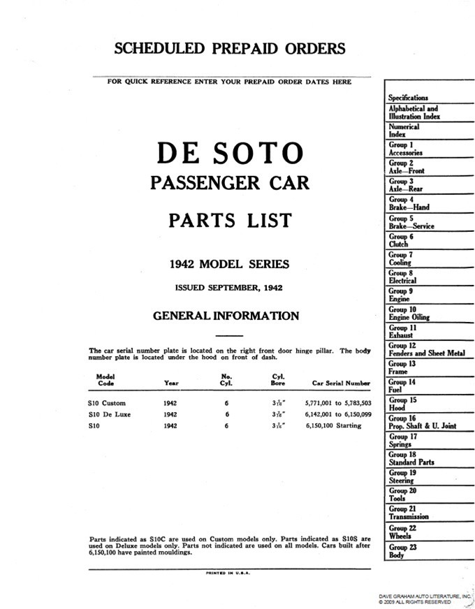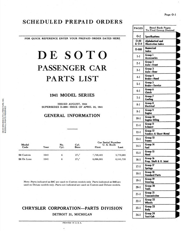 - the 376 page "1941 De Soto Passenger Car Parts List Model Series S-8 Issued October 1944 This List Cancels and Supersedes D-9991", and