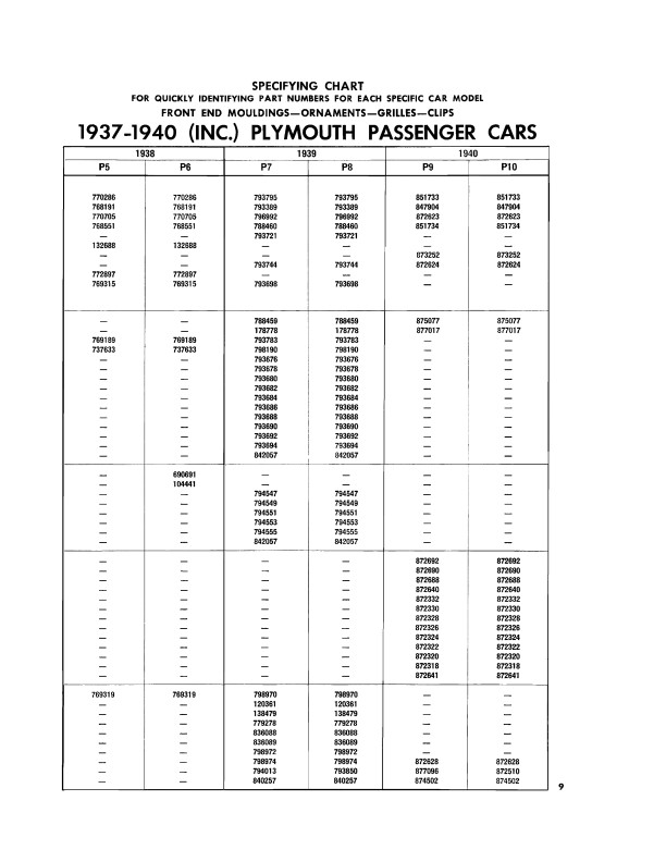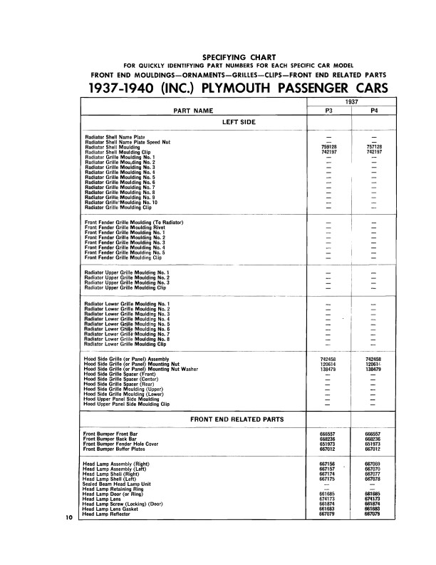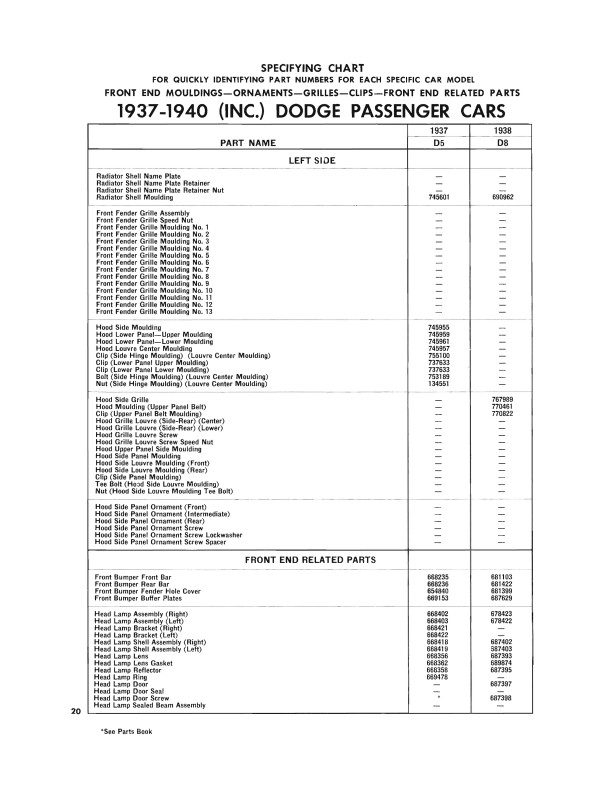 This is a quality licensed reprint of the book that garages, body shops, dealers and repair shops would have used to order MoPar body parts. It includes the most commonly needed parts. You will find bumpers, grilles, hoods, moulding, fenders, exterior lights, and more. Find original parts numbers, model application data and group numbers; as well as illustrations for easy identification. You get illustrations of one car for each year and make; for example, there is one picture of the front and one picture of the side of one model of 1937 Chrysler; part numbers are given for every model, but only one model is illustrated. Includes a list of serial numbers for each year. This book is in new condition. Buy now to make your search for parts easier.