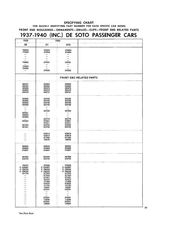 You will find original parts numbers, which are still useful today because most parts vendors still use those numbers to keep track of their own stock. You can also use this parts book to find out which parts on your vehicle interchange with other years and models covered in this book. Parts books are the authority on the correct equipment for your vehicle; you'll know definitively which parts and accessories are original when you use this book.