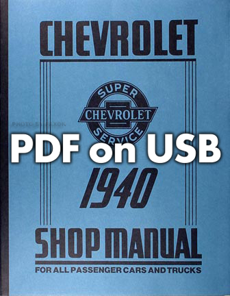 This USB offers page-for-page reproductions of two bound manuals that Chevrolet mechanics used to service vehicles. It includes the 284 page "Chevrolet Shop Manual – 1939" and the 282 page "Chevrolet 1940 Shop Manual." You will find detailed service procedures for lubrication, frame, shock absorbers, front suspension, front & rear axle, universal joints, front & rear springs, brakes, engine, fuel system, cooling system, clutch, transmission, vacuum gear shift, fuel tanks, exhaust, steering gear, wheels & tires, chassis sheet metal, electrical system, and radio repair. With the step-by-step illustrated instructions, specifications, and wiring diagrams on this USB , you will have the information you need to get your project on the road and keep it there. You can use the information on this USB to restore all 1939 and 1940 Chevrolets, including: Master 85 series JB & KB passenger & commercial cars, Master Deluxe series JA & KA cars, Sedan Delivery, Coupe Delivery, KH Commercial Cars with Knee Action Suspension, pickup, 1/2-ton Light Duty Truck Model JC, KC, and KP, 3/4-ton Light Duty Truck Model JD and KD, 3/4-ton Light Duty Special Truck Model JE and KE, 1-ton & 1.5 ton KF, VA, VA-S, and WA. Buy now to own the best shop manual for your vehicle on USB . We have manuals on paper also -- see our other items.