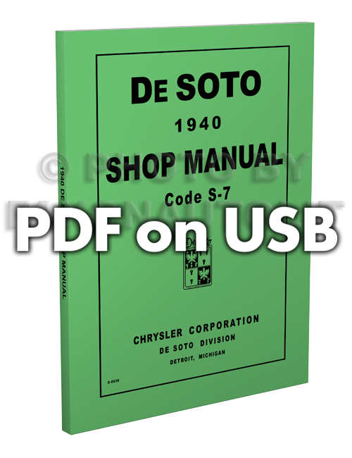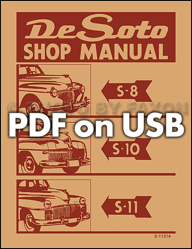 This USB offers a page-for-page reproduction of two bound manuals that DeSoto mechanics used to service cars. It includes the 193 page "DeSoto 1940 Code S-7 Shop Manual" and the 263 page "DeSoto Shop Manual S-8 S-10 S-11". Inside you will find detailed service procedures for front axle, rear axle, brakes, clutch, fluid drive, cooling system, electrical system, engine, fuel system, frame, springs, shock absorbers, steering, transmission, universal joints, propeller shaft, wheels, tires, body, and lubrication. With the step-by-step illustrated instructions, specifications, and diagrams in this manual, you will have the information you need to get your project on the road and keep it there. Buy now to own the best manual for your car on USB .