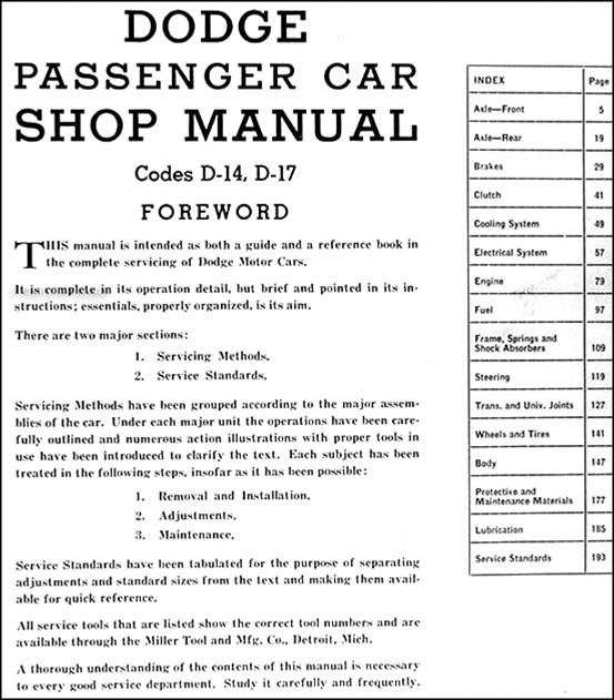 This USB includes images of the complete 230-page "1940 Dodge Shop Manual." This USB is a page-for-page high quality reproduction of the book that Dodge mechanics used to service vehicles. Inside you will find detailed service procedures for front axle, rear axle, brakes, clutch, fluid drive, cooling system, electrical system, engine, fuel system, frame, springs, shock absorbers, steering, transmission, universal joints, propeller shaft, wheels, tires, body, and lubrication. With the step-by-step illustrated instructions, specifications, and diagrams on this Windows-compatible USB , you will have the information you need to get your project on the road and keep it there. You can use the information in this USB to restore 1940 U.S. Dodge cars, codes D-14 and D-17, Luxury Liner, Special, & Deluxe. Buy now to own the best manual for your car on USB . We have manuals on paper also, see my other items.