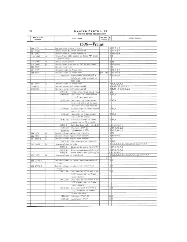 This catalog is a page-for-page reproduction of the February 1944 edition of the book that army mechanics used to order parts. This book will make your search for parts both quicker and easier. You will find the original part numbers, which are still useful today because most vendors still use factory numbers to keep track of their stock. The exploded views can aid you with assembly or disassembly of some parts of the vehicle. You will find part numbers and illustrations for engine, clutch, fuel system, exhaust system, cooling system, electrical system, transmission, transfer case, propeller shaft, universal joints, axles, steering, brakes, wheels, drums, hubs, frame and brackets, spring, body, cab, winch, power-take-off, and bumpers. You get numerical and alphabetical indexes for parts. Buy now to own the most comprehensive parts book for army Fords.