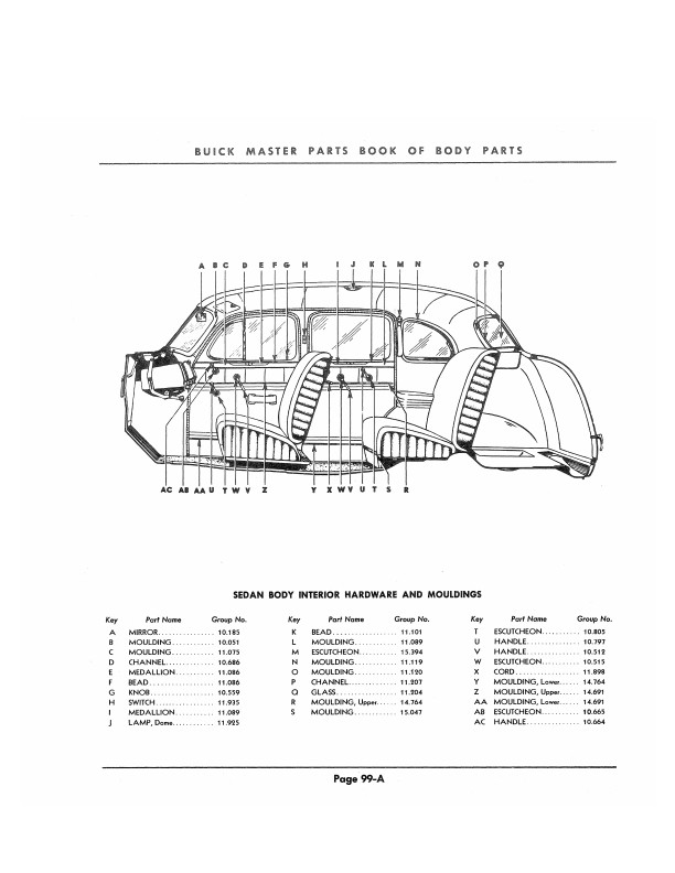 This book includes body and interior parts from the firewall back; a separate mechanical parts book usually covers the front fenders, grill, and dash. This is the book that dealership parts & service departments used to order parts. The illustrations in the book will help you to identify parts, and the exploded views can aid you with the assembly or disassembly of some parts of the vehicle. The text is a list of the parts available at the time of publication with data such as part numbers, model-year application and/or component application, part names, and more.