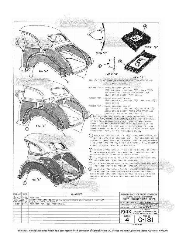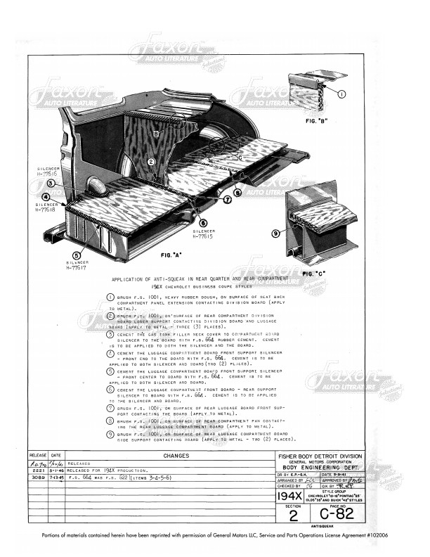 The book shows you how to cement in sound deadeners for the dash, shroud, doors, trunk, roof, rear quarter, and floor. Find out how to prevent squeaks in the instrument panel, floor pan, under window ventilator support, door hinges, trunk/rear compartment, and rear quarter. You will see illustrated instructions for lubricating hinges and hardware including: door lock mechanism, door hinges, door hardware, window regulators, trunk lid hardware, shroud top ventilator hinge, glove box door hinge and spring, and seat adjusters.