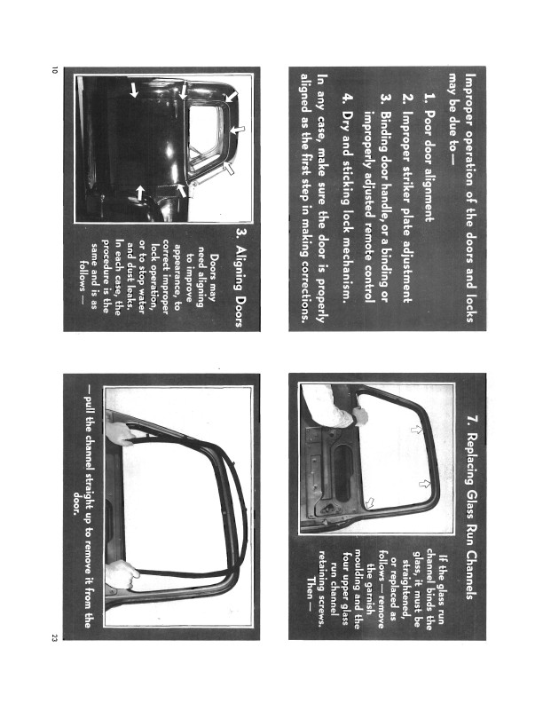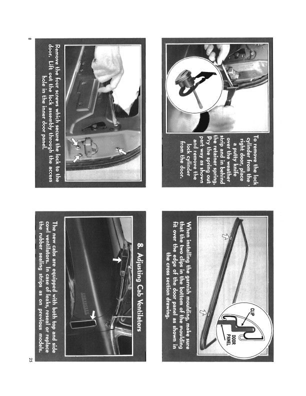 This is a quality reprint of the manual Chevy dealer mechanics used to learn new procedures. You will find complete instructions for operation & replacement of the door locks, aligning the doors, adjusting the striker plates, checking door weather strips, replacing door glass, replacing glass run channels, adjusting cab ventilators, and adjusting the windshield wipers. The instructions are presented in a slide show style where all instructions are accompanied by a black and white picture. The book is in NEW condition! Truck body information for this era is scarce. Buy now to own the this hard-to-find info on your Chevy truck