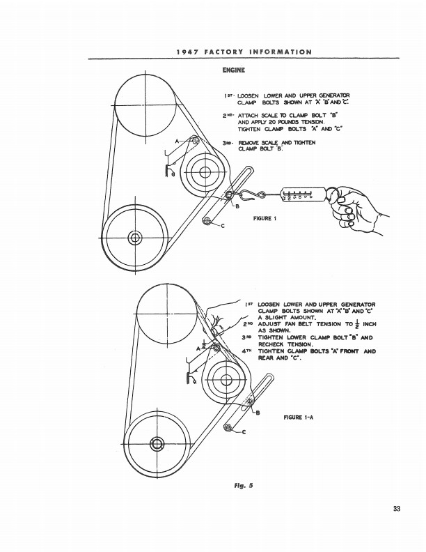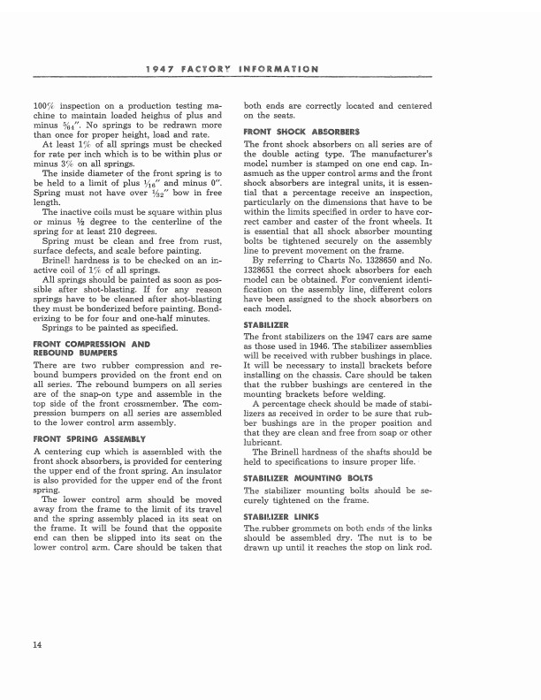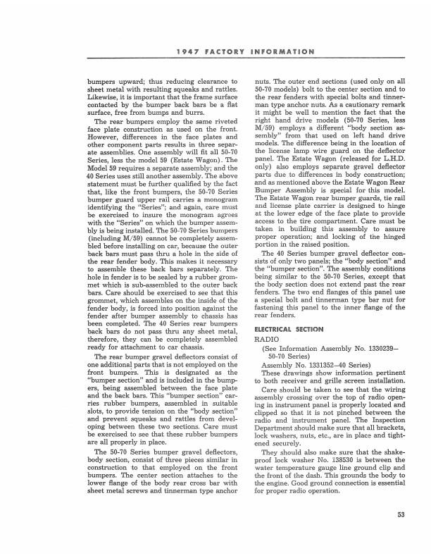 This manual describes the parts used in assembly, often identifying what they’re made of and how they are sealed. Sometimes, you’ll learn specific instructions for a how a part is installed. Or, you’ll find out tips to take special care in cleaning, adjusting, or sealing a part to prevent problems. Areas of carryover and change from 1946 are often addressed. You’ll see specifications for adjusting and lubricating parts. Sometimes you’ll see tests to make sure a part is installed properly. You’ll see this type of information for engine, transmission, rear axle, fuel tank, exhaust, fenders, bumpers, locks, trunk lining, hood, dash electrical cables, and brakes.