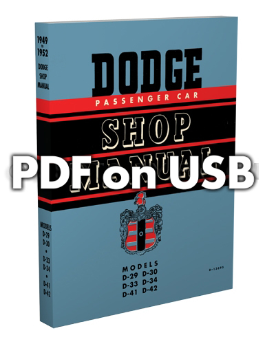 This USB offers page-for-page reproductions of the bound manual that Dodge mechanics used to service cars. It includes the 469 page "1949 - 1952 Dodge Passenger Car Shop Manual." You will find detailed service procedures for front axle, rear axle, body and sheet metal, brakes, clutch, cooling, electrical, engine, exhaust, fluid drive, frame, fuel system, lubrication, propeller shaft and universal joints, shock absorbers, springs, steering, transmission, wheels and tires. With the step-by-step illustrated instructions, specifications, and wiring diagrams on this USB , you will have the information you need to get your project on the road and keep it there. The best part is that you can print out the pages you need, dirty them in the shop, and then throw them away. Great if you have a hard copy that you want to keep clean. You can use the information on this USB to restore all 1949, 1950, 1951, and 1952 Dodge cars, including Wayfarer, Meadowbrook, Coronet, and wagons. Buy now to own the best manual for your vehicle on USB . We have manuals on paper also -- see our other items.