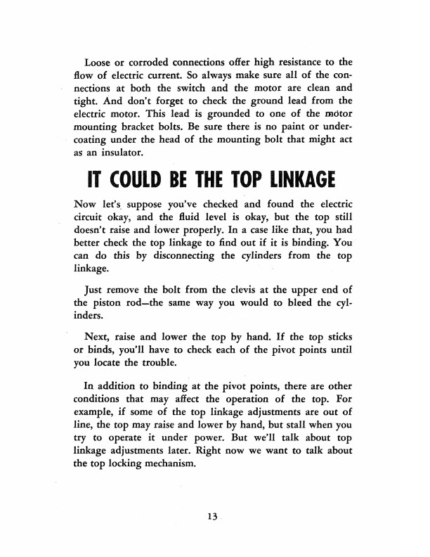 This is a quality, licensed reproduction of the manual that Chrysler used to train its dealer mechanics to work on convertible tops. You will learn how to add fluid, bleed air out of the system, check the fit of the boot, troubleshoot the electric circuit, align dowels and locking pins, seal leaks in the header, adjust linkage, align the top, adjust windows, diagnose typical problems, and perform regular maintenance. You also get an explanation of the how the system works (switch, pump, reservoir, motor, cylinders, linkage, and lock). The manual does NOT show how to install new convertible top fabric. Some of the instructions are similar to the shop manual, but this book contains additional information that is different from the shop manual. This is in new condition. This is a reprint of a book that was originally printed in 1950, and covers 1949-1952 Mopar convertibles. Buy now to get the best information on your convertible top.