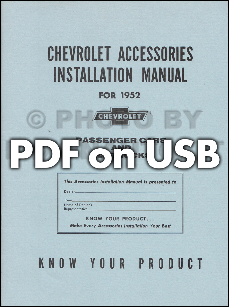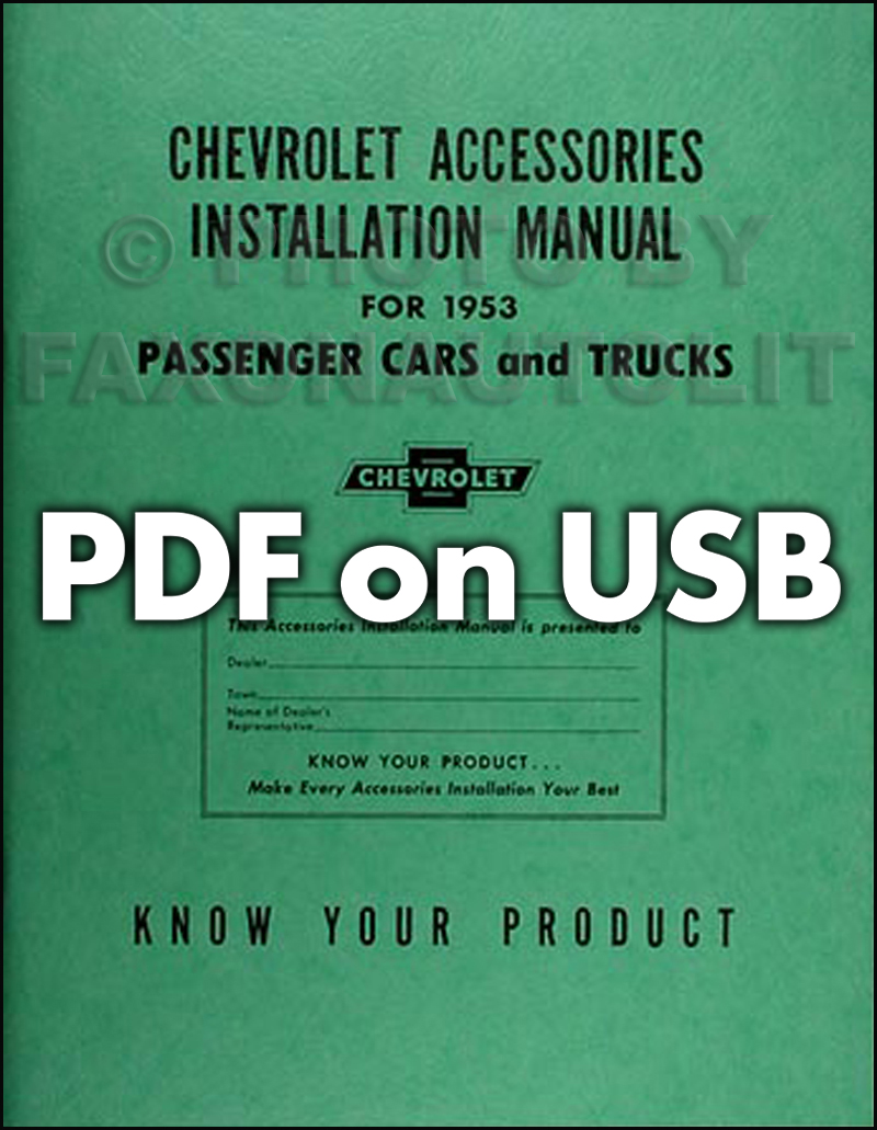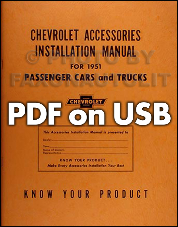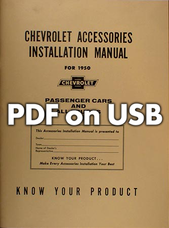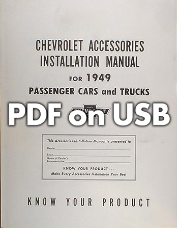 This licensed USB offers page-for-page .pdf reproductions of the 1949, 1950, 1951, 1952, 1953, & 1954 "Accessories Installation Manual" for Chevrolet Cars & Trucks; the manuals issued by Chevrolet to train mechanics to install genuine Chevrolet accessories. In this USB you will find step-by-step installation instructions accompanied by exploded view illustrations making every procedure a breeze. You will also find original part numbers to easily reference all available accessories including: A/C adapters, antennae, seat belts, luggage carrier, tissue dispenser (did you know they had those?), glare shades, horns, mirrors, radios, visors, and much, much more! This USB covers all 1949-1954 Chevy Car & Truck models. The 1949 manual has 149 pages, the 1950 manual has 69 pages, the 1951 manual has 98 pages, 1952 manual has 98 pages, the 1953 manual has 116 pages, and the 1954 manual has 151 pages. Buy now to make your Chevy into a "loaded" model.