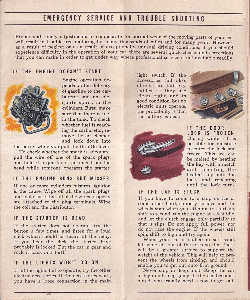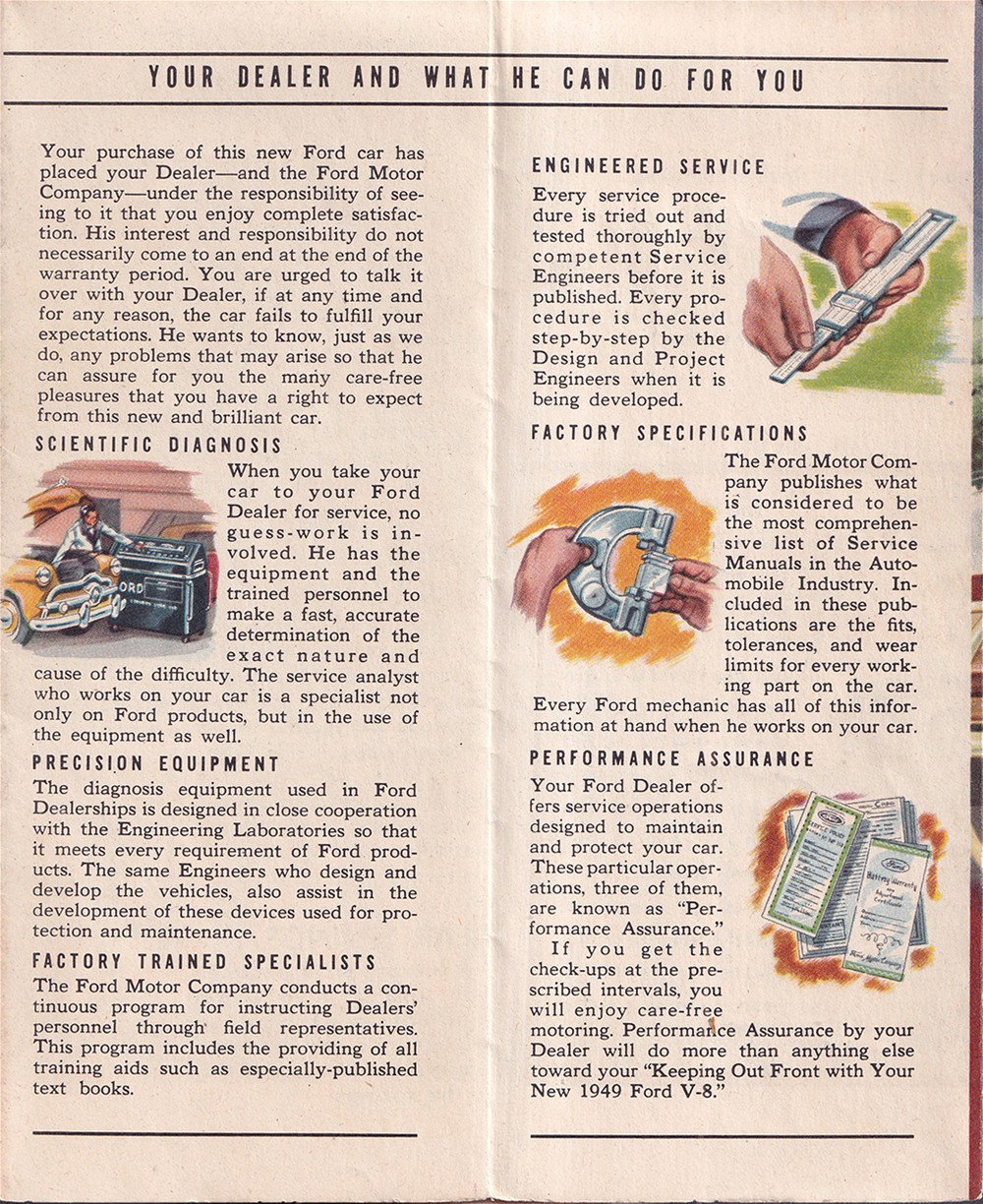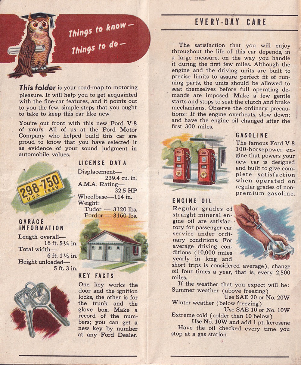 This is an original, unusual and rare glove box owner's guide that came with your 1949 Ford V-8. It unfolds like a road map to reveal directions on how to operate, care for, service, and diagnose common problems with your car. In its full 36" x 24" size you will see large full-color diagrammed illustrations of the undercarriage, under-the-hood, and the driver's position. The manual includes the location of all the grease gun fittings, license data, vehicle dimensions, a table of fluid capacities, three-on-the-tree shifting instructions, service procedures you can do in your home garage, and much more. Buy now for the best manual now for your 1949 Ford V8.