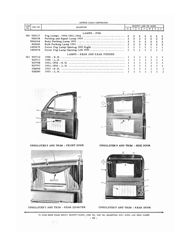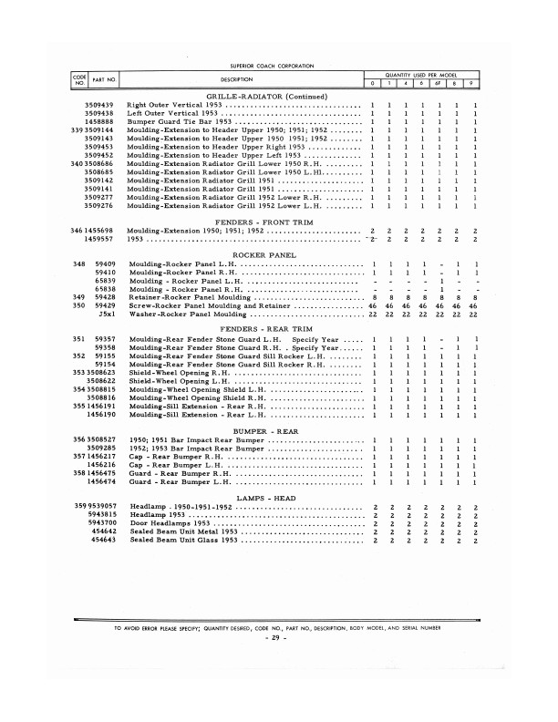 This is a quality, authorized reproduction of the manual printed by Superior to order parts for bodies and also to repair them. You will find step-by-step illustrated repair instructions for door alignment, weather-sealing, and flushing the hydraulic seat & flower car deck system. You will learn how to remove & install seats, locks, window regulators, the windshield, windshield wiper transmission. You also get a foldout wiring diagram. The parts section shows pictures of parts, along with part numbers and descriptions. You will see a skeleton view of the body pillars, as well as photos of the interior and exterior of the cars. The manual includes parts peculiar to Superior bodies that differ from standard Cadillacs, such as bumpers, pillars, doors, trim, upholstery, roof, drapes, electrical, glass, weather-stripping, hardware, mouldings, partition, lamps, locks, fenders, and exhaust system. For mechanical parts and body parts that professional cars share with other Cadillacs you will need the This manual covers all 1950-1953 Cadillac Superior bodies including Hearse (side service, rear loading, Landau), Flower Car, Service Car, Field Ambulance, and Ambulance. It includes models 1500, 1501, 1504, 1506, 1506-F, 1508, and 1509. The book measures 8.5" x 11" and has 50 pages. Buy now to own this hard-to-find manual for your car.