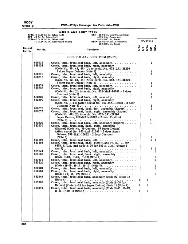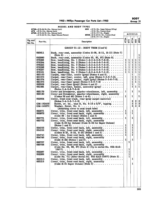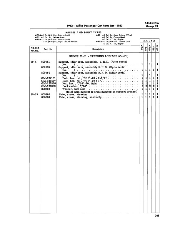 This is a reprint of two books that a Willys dealer's parts department used to order parts. You will find illustrations and the original part numbers, which are still useful today because most parts vendors still use Willys numbers to keep track of their parts. Use this book to make your search for parts both quicker and easier. The illustrations in the book will help you to identify parts, and the exploded views can aid you with assembly or disassembly of some parts of the vehicle. You can also identify if the parts you are buying are original and complete; if you're missing parts, you can use the book to see what you should have. If the same part number is used for more than one year, you can also find out interchange between the different years and models covered in the book. You'll see original part numbers for mechanical parts, body parts, and accessories. The book includes a convenient alphabetical index by part name, as well as a numerical index by part number. This manual includes the 1952-1953 base parts book as well as the 1954-1955 Willys Passenger Car Supplement. Buy now to own the best parts book for your Willys.
