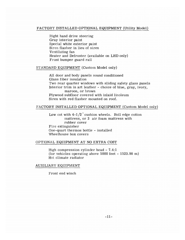 Jeep Truck: Canopy top, bumper guards, bumper with trailer hitch, service body, dump bed, parcel delivery body, welder, lift gate, hubs, draw bar, air compressor, generator, winches, snowplow, two-wheel trailers, backhoe, wrecker, cargo personnel carrier, and fire truck.