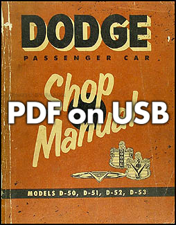This USB offers page-for-page reproduction of the bound manual that Dodge mechanics used to service cars. It includes the 845 page "1954 Dodge Passenger Car Shop Manual." You will find detailed service procedures for front suspension, rear axle, body, sheet metal, brakes, clutch, cooling, electrical, engine (6-cyl, 8-cyl), exhaust, fluid drive, gyro-torque drive, frame, fuel system, lubrication, propeller shaft, universal joints, shock absorbers, springs, steering, transmissions (standard, overdrive, powerflyte, gyro-matic), wheels, tires, and air conditioning. With the step-by-step illustrated instructions, specifications, and wiring diagrams on this USB , you will have the information you need to keep your project on the road. The best part is that you can print out the pages you need, dirty them in the shop, and then throw them away. Great if you have a hard copy that you want to keep clean. You can use the information on this USB to restore 1954 Dodge Meadowbrook, Coronet, Royal, Sierra, and Suburban, which are D-51, D-52, D-50, D-53 models. Buy now to own the best manual for your vehicle on USB . We have manuals on paper also -- see our other items.