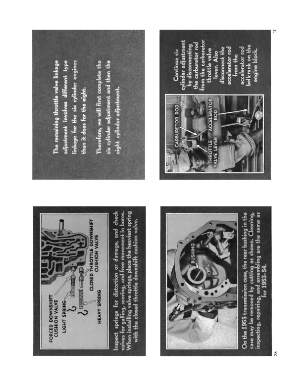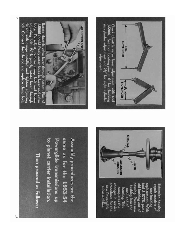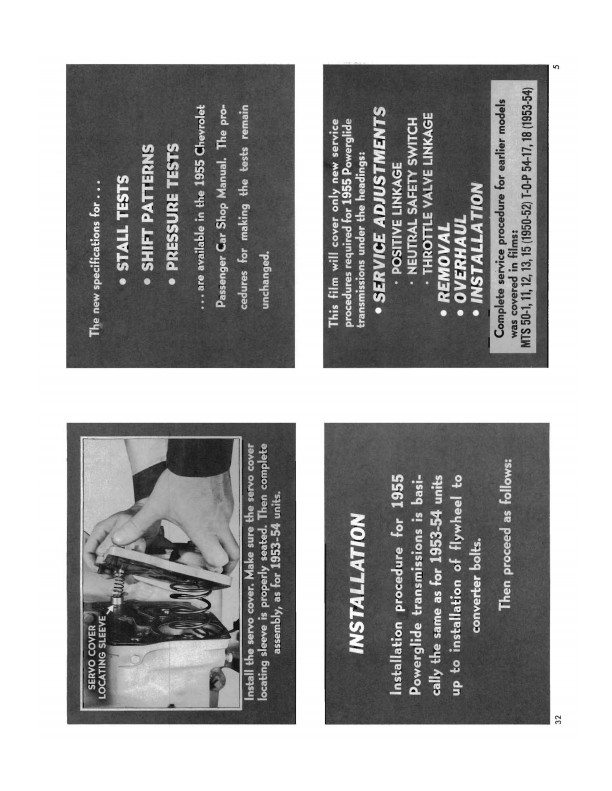 This manual was written to train Chevy dealer mechanics to work on the 1955 Powerglide automatic transmission. It explains how to adjust the positive linkage, neutral safety switch, and throttle valve linkage. You'll also learn how to remove the extension housing. You'll also learn about new features of the 1955 transmission that differ from the 1954 model. Buy now to get this factory info on the Powerglide.