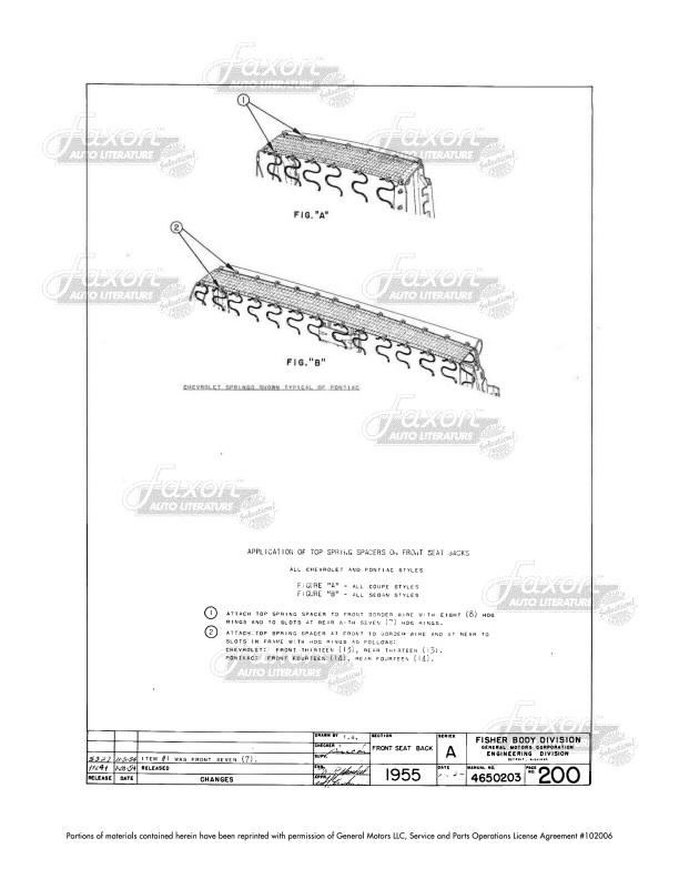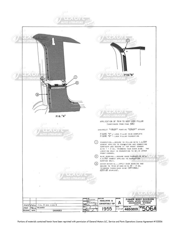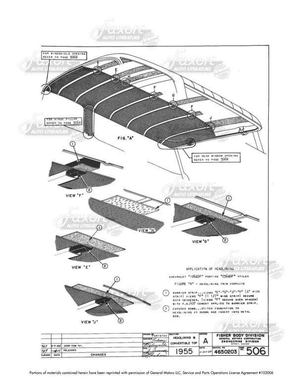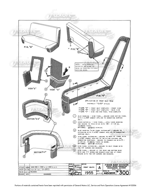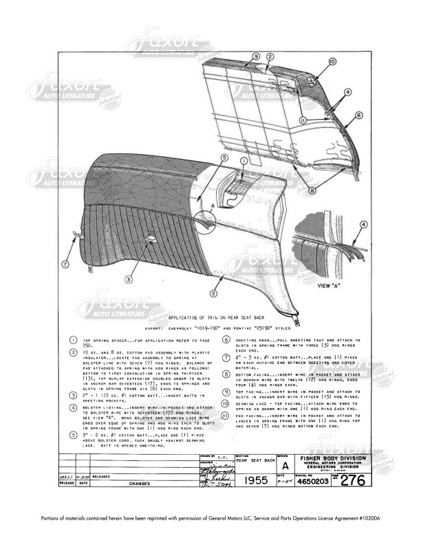 This manual shows you how to install upholstery and fabrics on your car. You can also use this manual to help identify parts that may be missing or incorrect. You'll see cutaway views of trim, along with types and amounts of fabric and materials used. Find out instructions for the order and placement of fabrics and sound deadeners, along with pictures showing how they are applied (with wires, cemented, sewn, etc.). You'll see a chart with materials used, threads used on the top and bottom, the type of stitch used, and stiches per inch. When it comes to parts like a seat cover, the book shows you how to install the cover and secure it to the seat, but it does not show you how to sew the inside parts of the seat cover itself (such as pleats on the front).