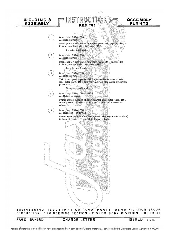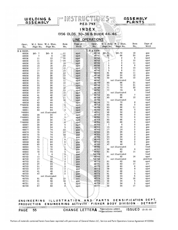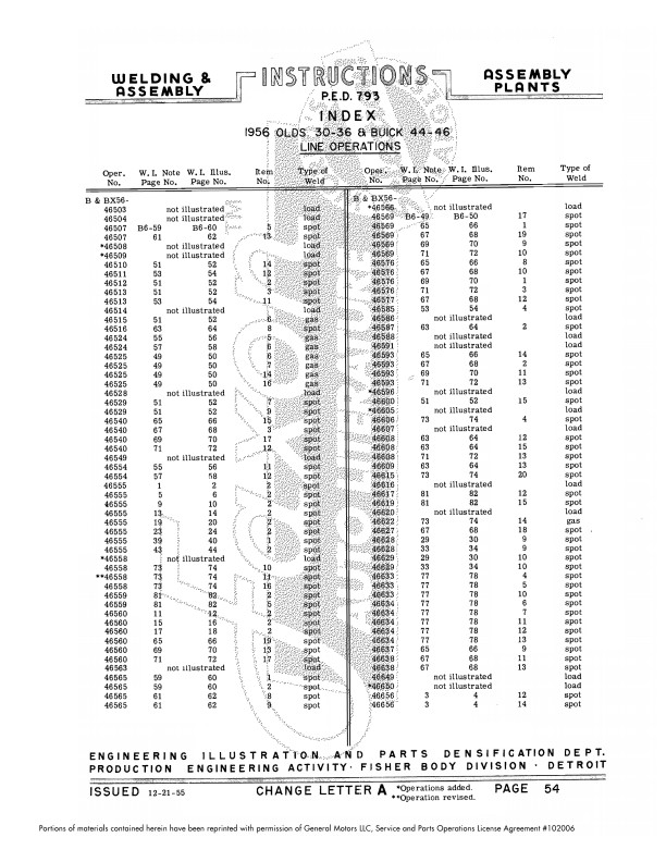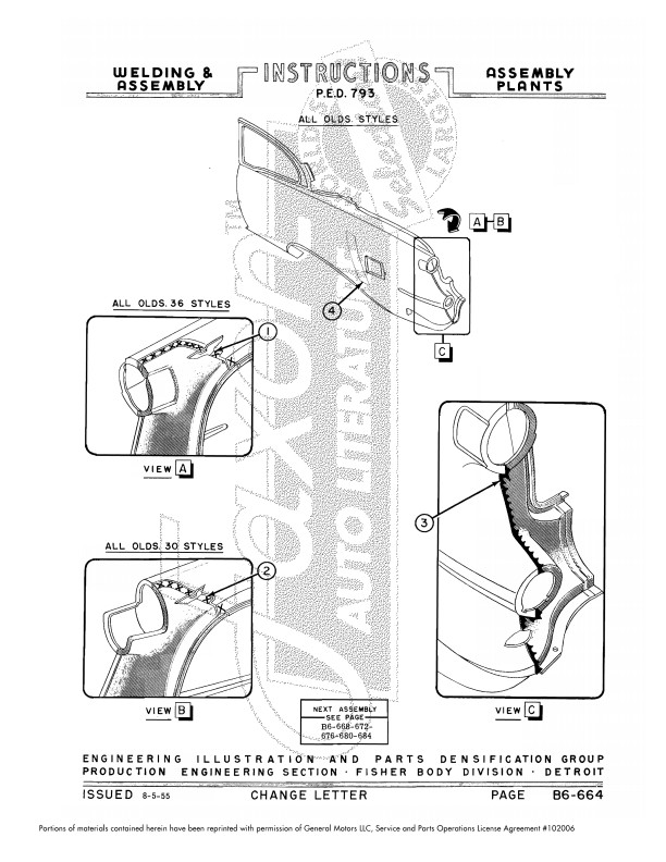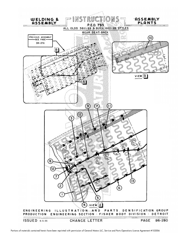 This assembly manual is unlike anything you've ever seen. This Fisher body plant assembly manual shows how metal body parts are welded together - it shows the location of hundreds of welds.  It’s helpful for hidden welds holding up parts you might need to remove and replace.  If you’re replacing parts due to rust, you’ll find out how to replace mounting parts that have rusted away.  The book is particularly useful if the car has had damage from a wreck.  You learn the specific type of weld (stitch, gas, seam, etc.) that was originally used in each location.