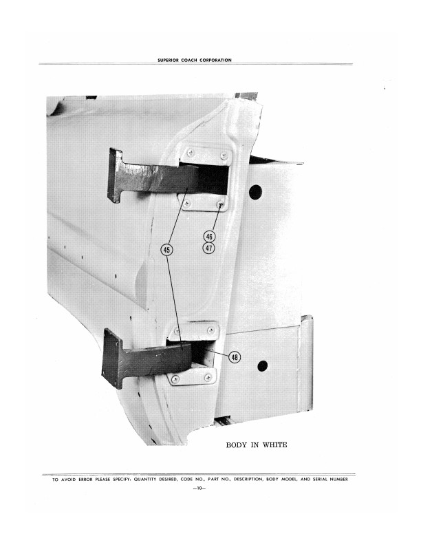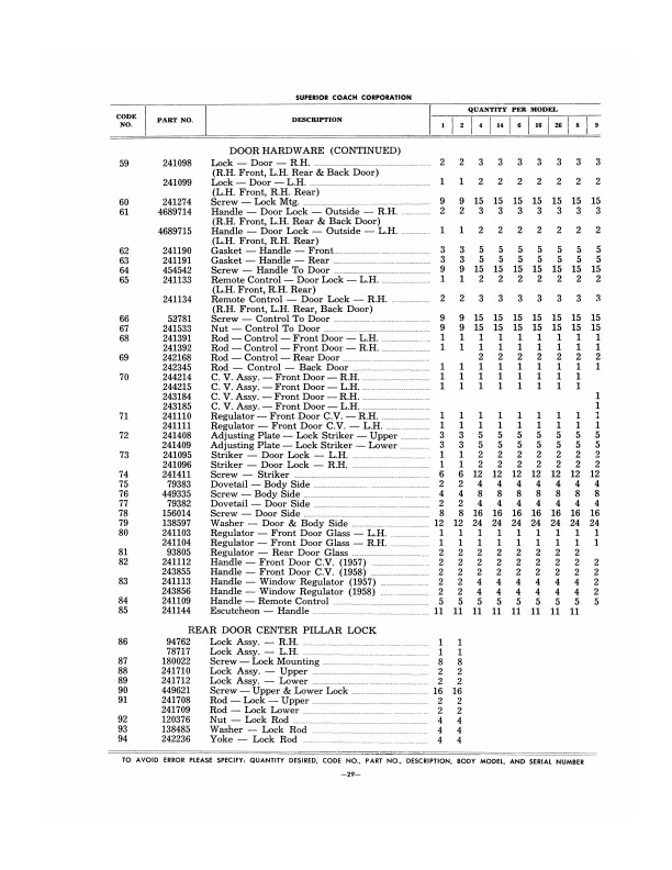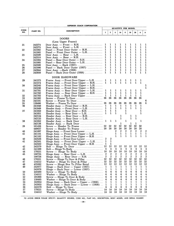 This is a quality, authorized reproduction of the manual printed by Superior to order parts for bodies. It shows pictures of parts, along with part numbers and descriptions. You will see a skeleton view of the body pillars, as well as photos of the interior and exterior of the cars. The manual includes parts peculiar to Superior bodies that differ from standard Cadillacs, such as bumpers, pillars, doors, trim, upholstery, roof, drapes, electrical, glass, weatherstripping, hardware, mouldings, partition, locks, rear quarter, and exhaust system. For mechanical parts and body parts that professional cars share with other Cadillacs you will need the Cadillac parts book. Although Superior titled the book "Parts and Service Manual," it appears to be all parts and not to have service instructions. It does include a wiring diagram. This manual covers all 1957-58 Cadillac Superior bodies including Hearse (side service & rear loading), Flower Car, and Ambulance. It includes models 601, 602, 604, 614, 606, 608, 609, 626, and 616. The book measures 8.5" x 11" and has 46 pages. Buy now to own this hard-to-find manual for your car.