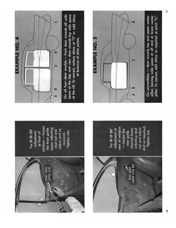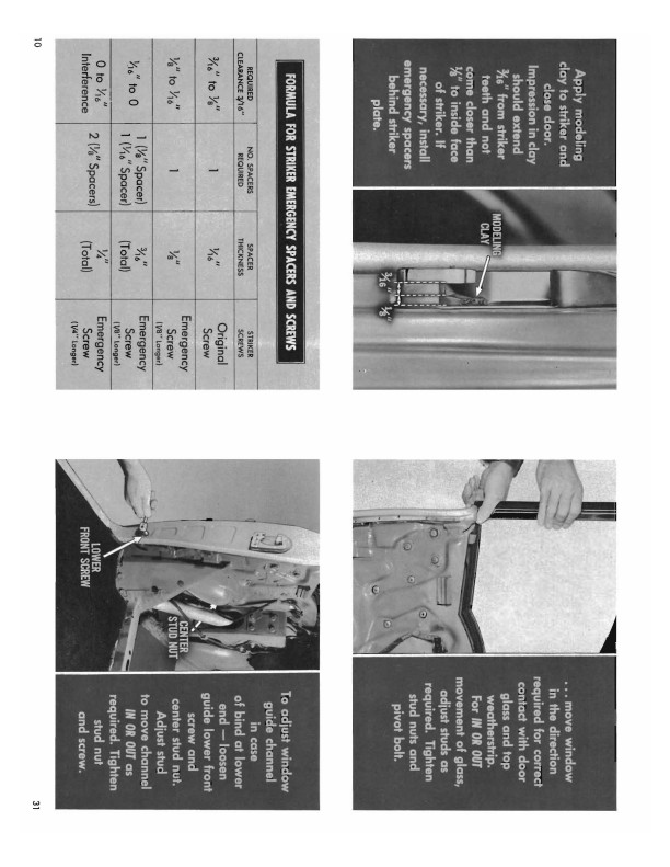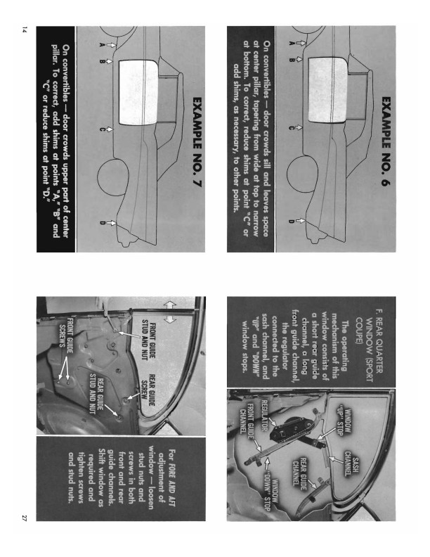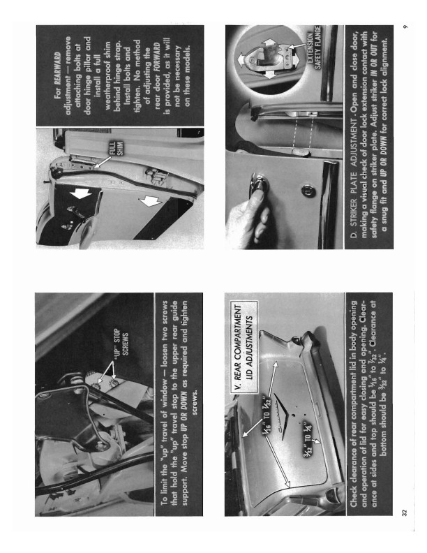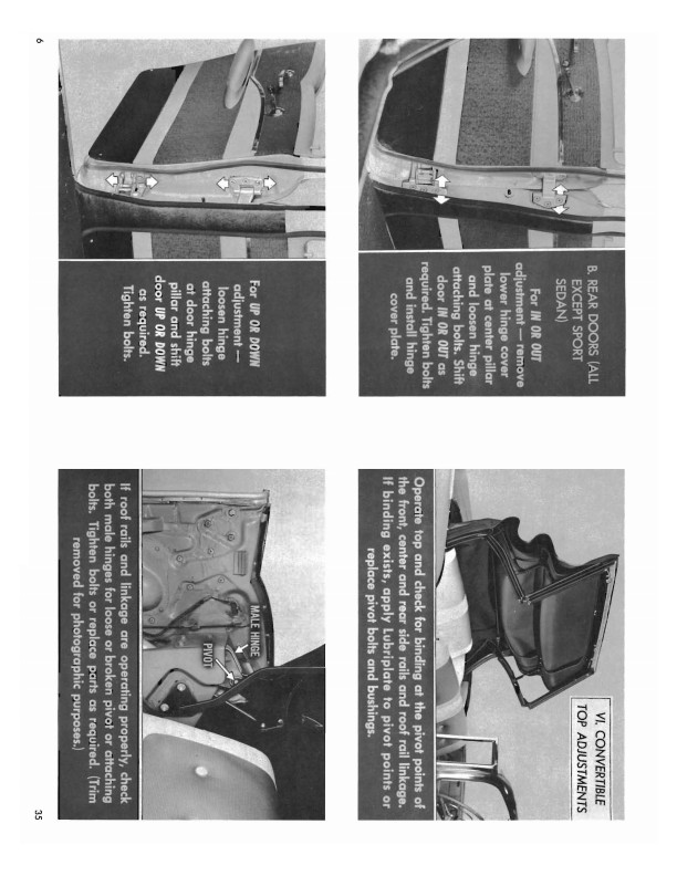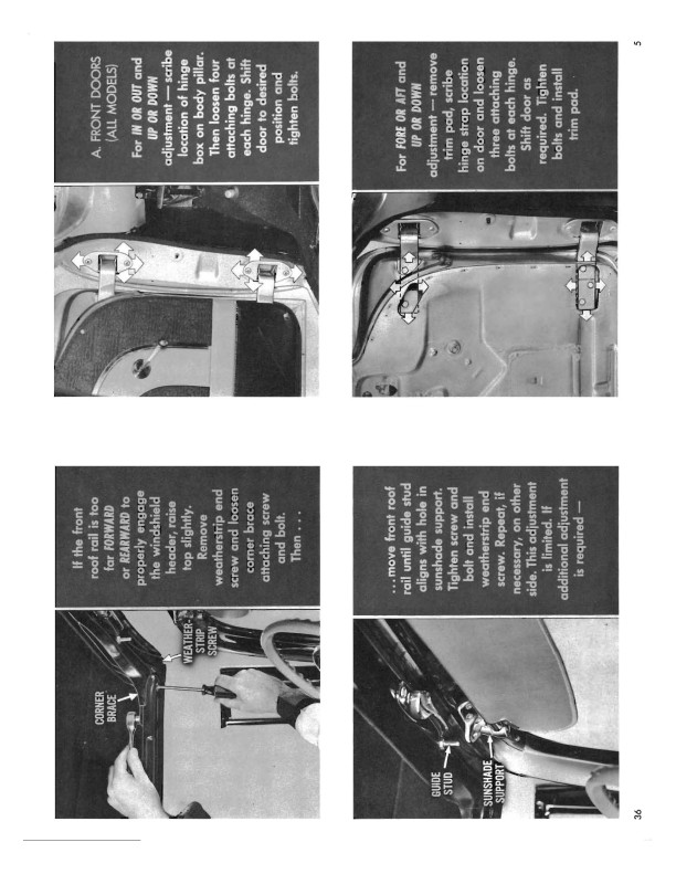 This is a reprint of the manual made to train dealer mechanics to adjust doors, windows, and convertible top. You will find step-by-step illustrated instructions for adjusting windows, including vent windows, door glass, and rear quarter windows. Learn about correct door clearances, shimming, and adjustments to hinges, striker plates, and body bolts. You'll also see trunk lid adjustment. For the convertible, find out how to adjust the header bracket, striker plates, hinge bolts, weatherstripping, and adjusting plate. Buy now own this hard to find manual.