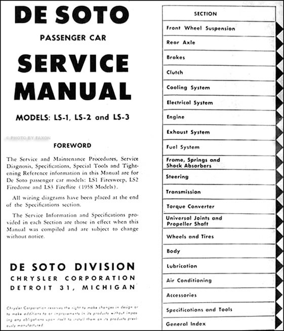 - the 462 page 1958 "De Soto Service Manual Firesweep LS1 Firedome LS2 Fireflite LS3",