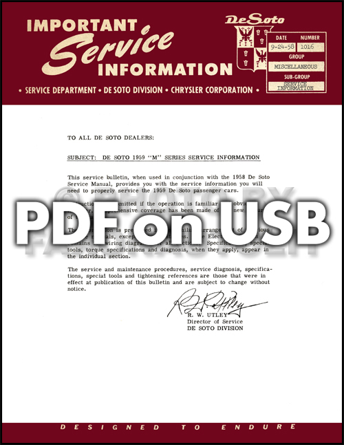 This USB offers page-for-page reproductions of four bound manuals that De Soto mechanics used to service cars. It includes: