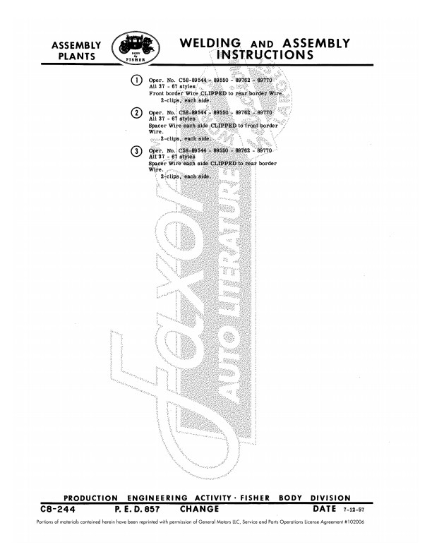 The book covers cars from the firewall back; the hood and front fenders are not covered (because these were assembled at the chassis assembly plant and not the Fisher body plant). Please see the sample page image. All pages are watermarked with a background image like the sample page. Buy now to own this hard-to-find manual.