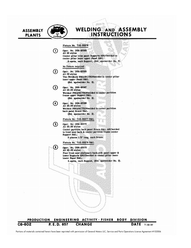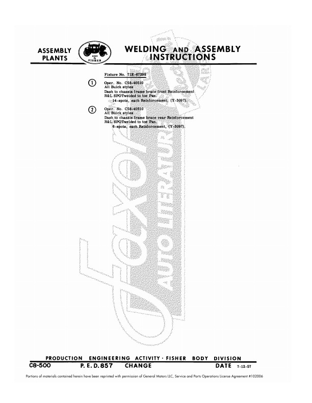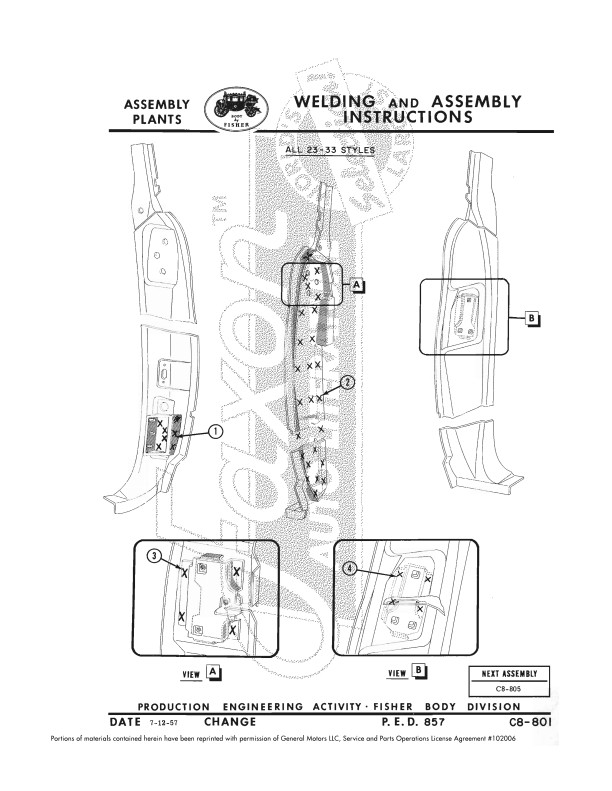 This assembly manual is unlike anything you've ever seen. This Fisher body plant assembly manual shows how metal body parts are welded together - it shows the location of hundreds of welds. It’s helpful for hidden welds holding up parts you might need to remove and replace. If you’re replacing parts due to rust, you’ll find out how to replace mounting parts that have rusted away. The book is particularly useful if the car has had damage from a wreck. You learn the specific type of weld (stitch, gas, seam, etc.) that was originally used in each location.