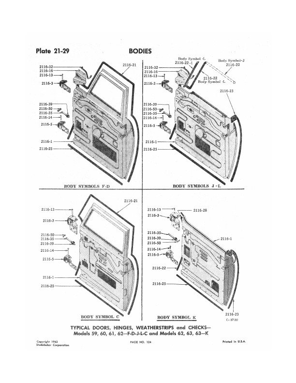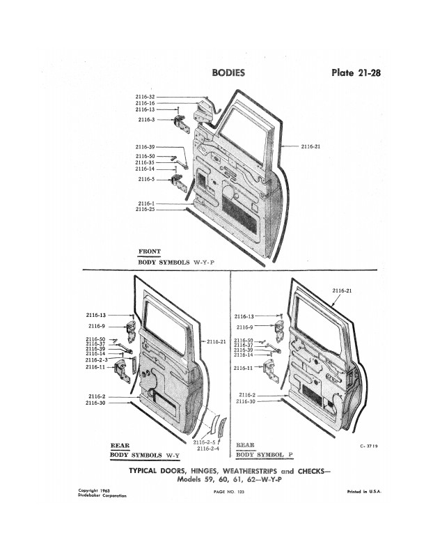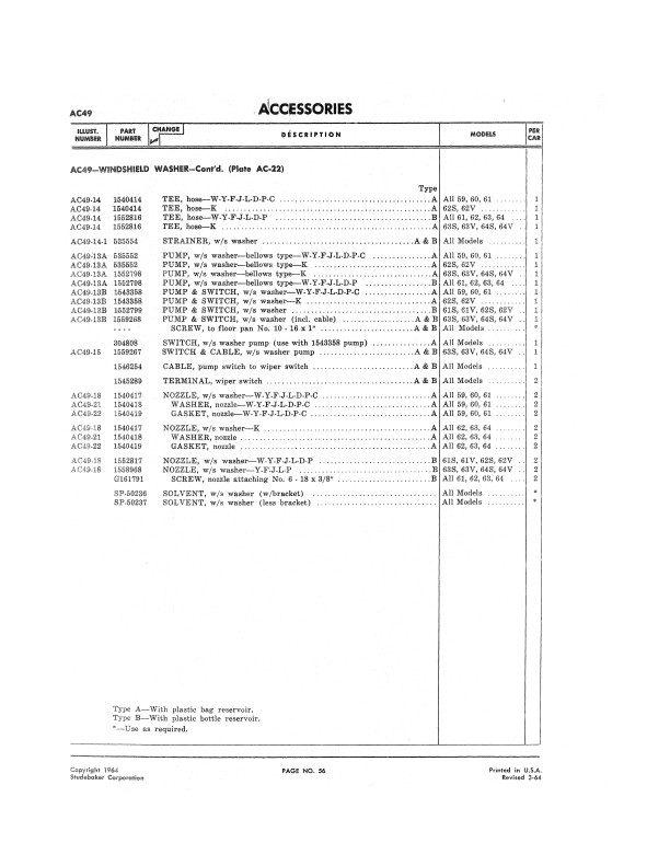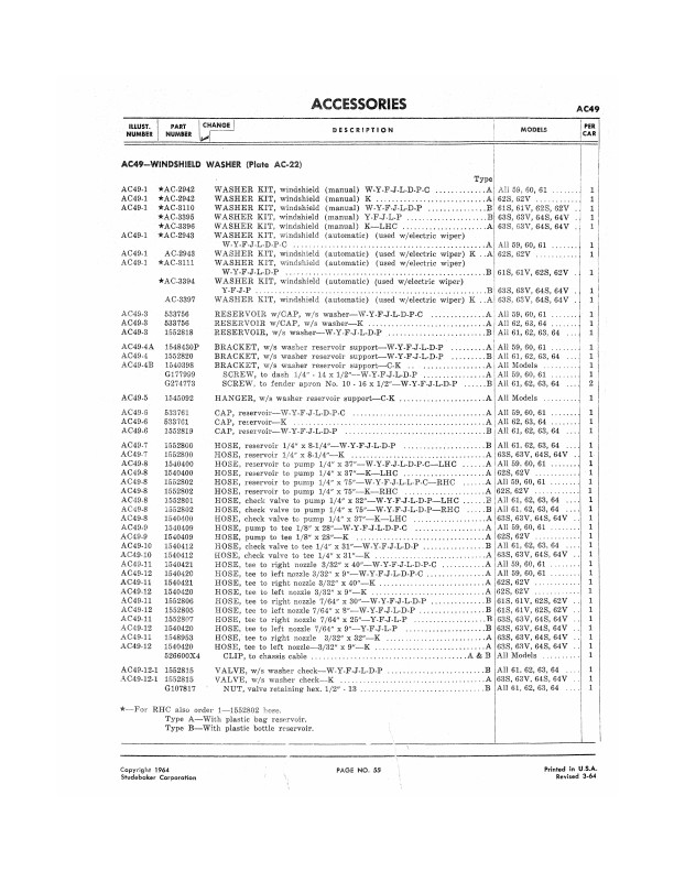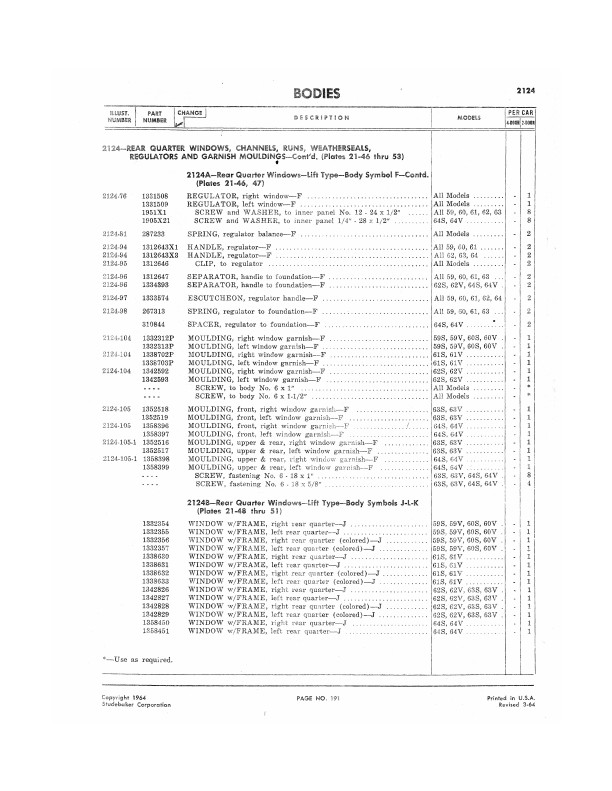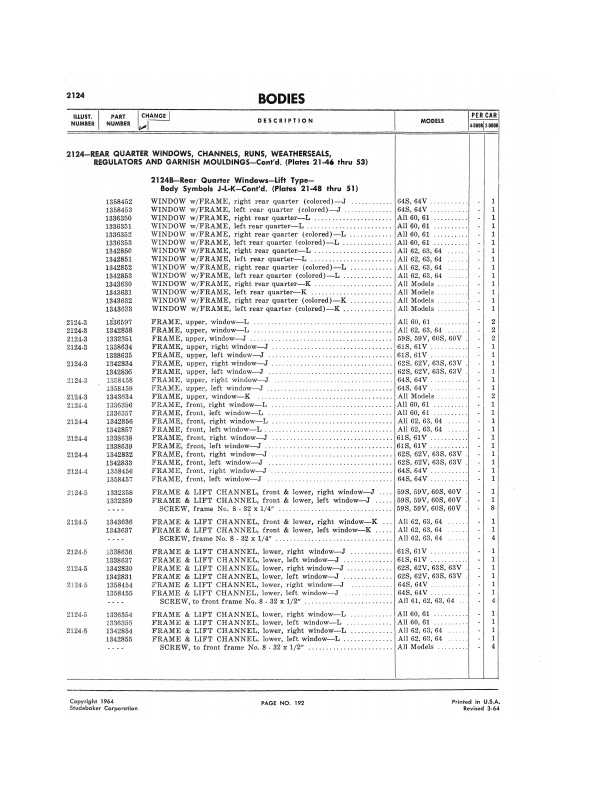 This is a reproduction of the book that the dealer's parts department used so that customers could order car body parts. You will find model numbers and serial numbers for easy identification of your vehicle. Get the original parts numbers to help those vendors get you the right equipment. You can use the exploded illustrations to find out exactly what you need, and how to put it together. You will find components like the air conditioner, air ventilator, auxiliary floor mats, coat hooks, windows, mouldings, body belts, body panels, cigar lighters, climatizer, defroster, dash heater, lights, interior trim, locks, handles, door sill finishing plates, window ventilators, weather seals, seats, floor boards, console, folding top, luggage rack, radio, antenna, mirrors, carpet, seat belts, visors, tail gates, toe board, trunk, windshield wipers, and more! Find out if the parts you are buying are original and complete. You won't want to miss the opportunity to own this hard-to-find book loaded with illustrations. New condition. Buy now for your ultimate body parts resource for '59-'64 Studebakers.