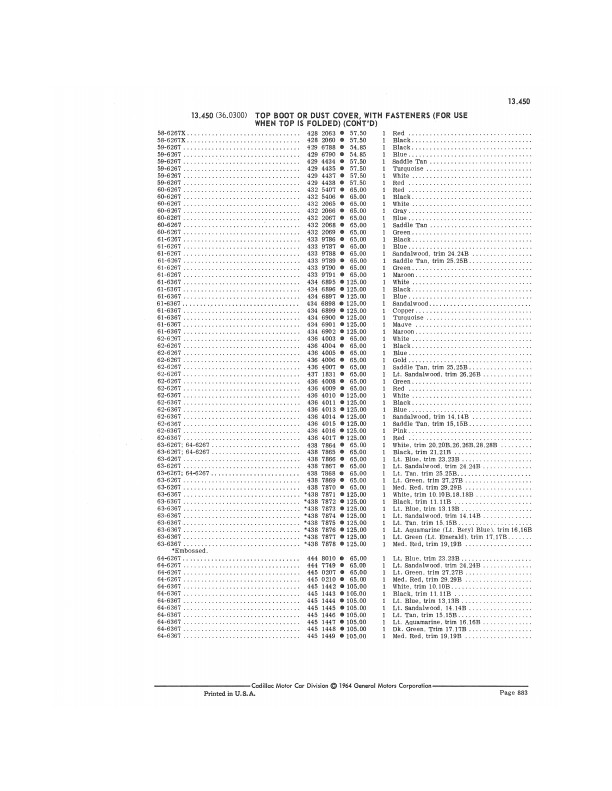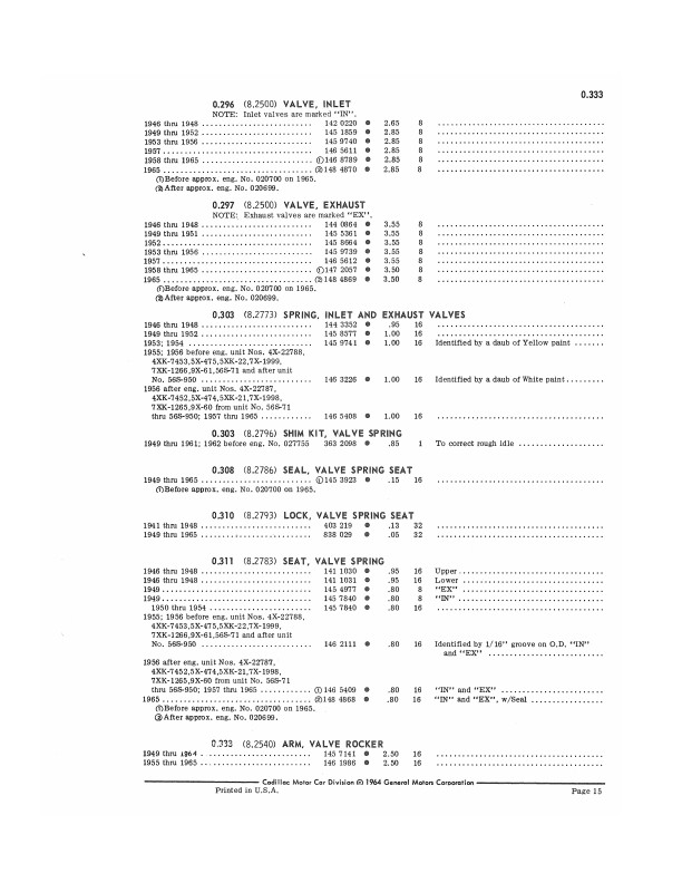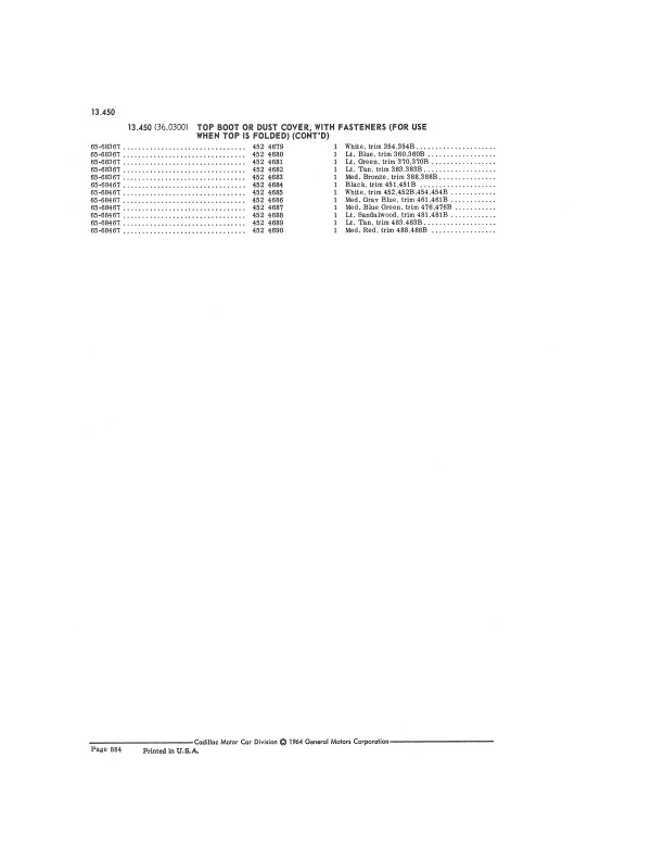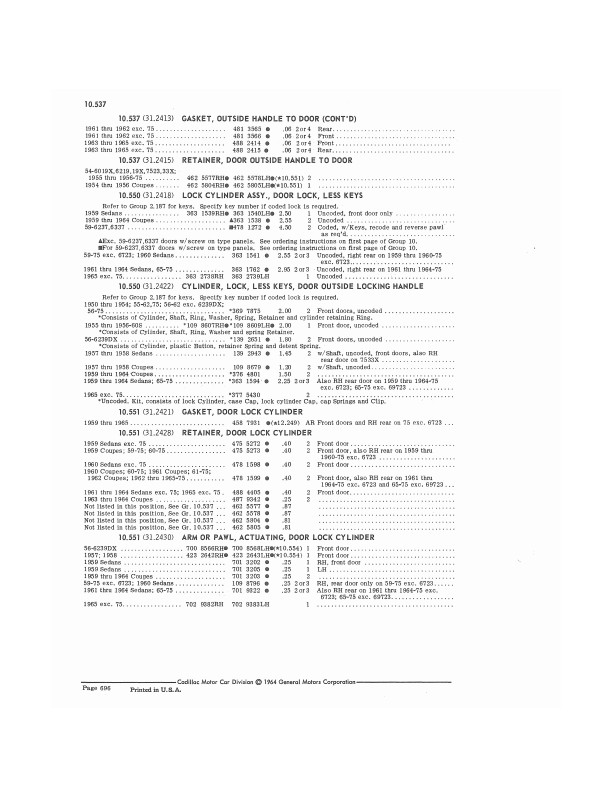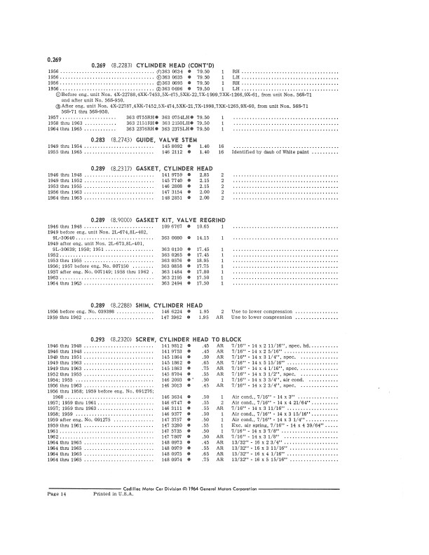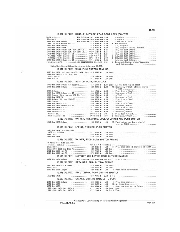 "Cadillac Master Parts List" This reprinted book is your ultimate resource for original part numbers with illustrations for early model Cadillacs. It is a reproduction of the book your Cadillac dealer would have used to order parts back in 1965. You will find any part on your car. The numerical and alphabetical lists cover practically every part that could be serviced from the factory. You will also find exploded view illustrations, exterior/interior color combinations, trim packages, group & part numbers, most of the standard hardware (nuts and bolts), the quantity per car, and each part's applicable year. You can use this book to help you find parts today because most parts dealers still use Cadillac's original part numbers to keep track of their parts. You can also identify if the parts you are buying are original and complete; if you're missing parts, you can use the book to see what you should have. Buy now to own this useful manual.
