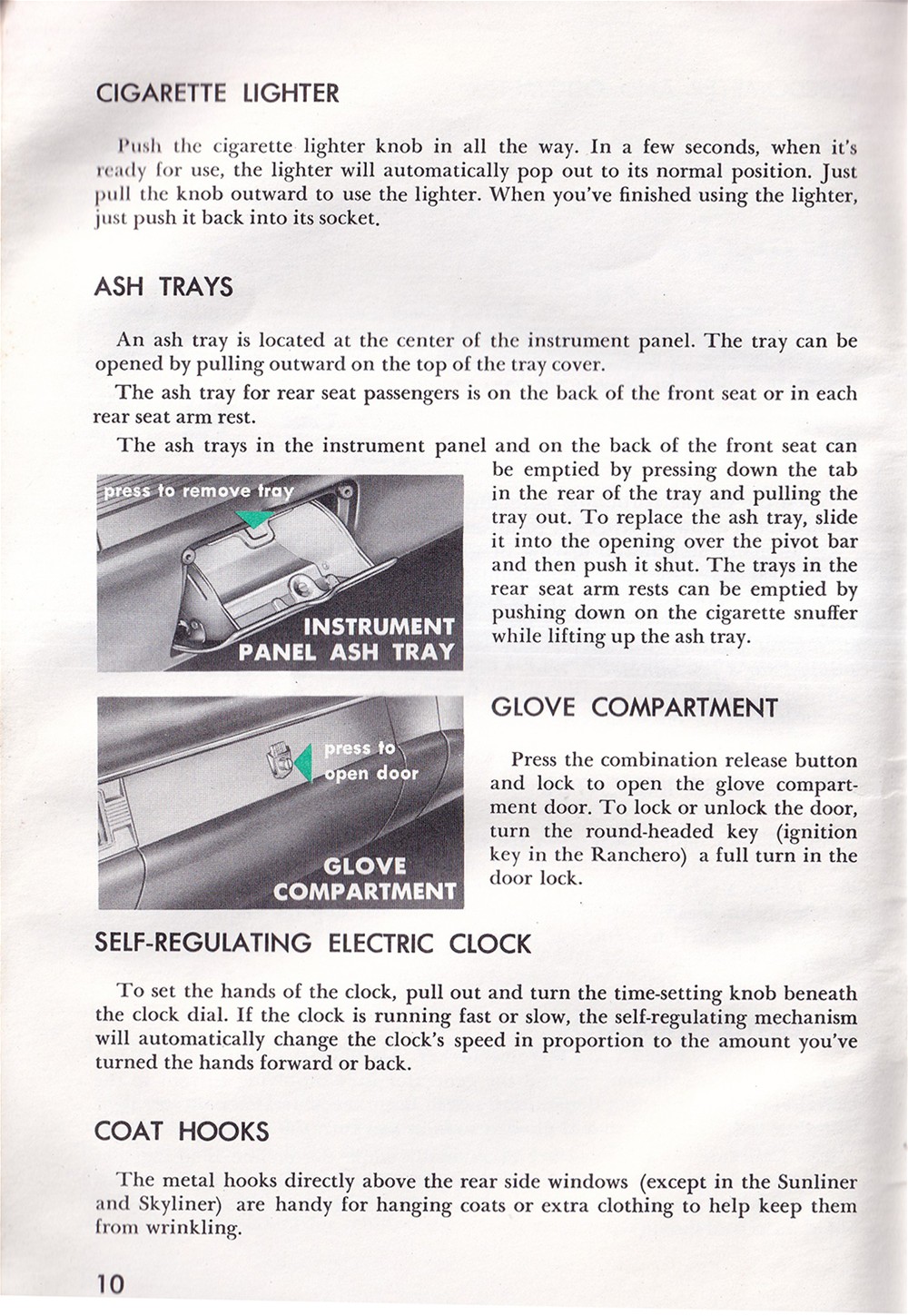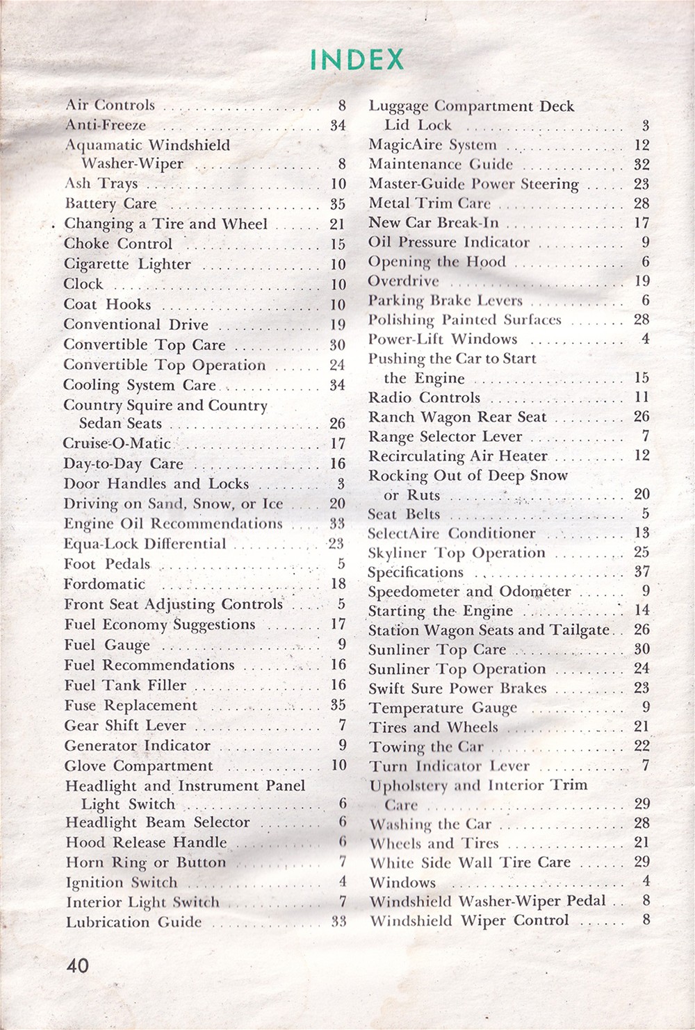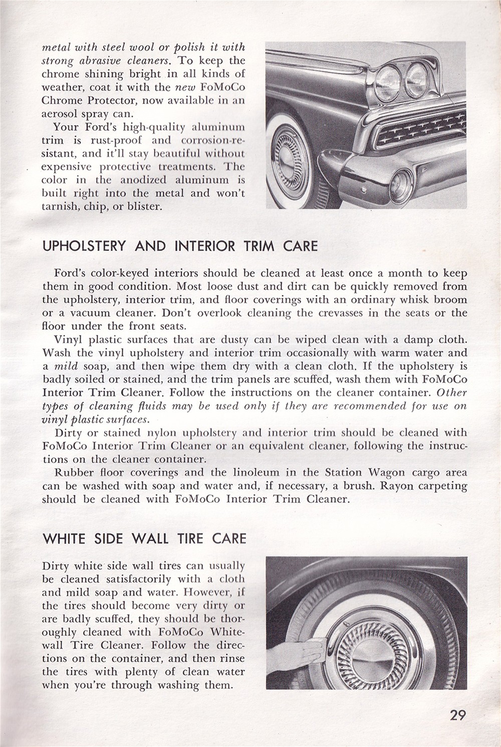 This is an original owner's manual that came with your 1959 Ford. Inside you will find out about operation of the air cleaner, battery, brakes, carburetor, clutch, convertible top, cooling system, engine, Fordomatic, suspension, hardtop, fuel pump, fuel filter, MagicAire system, oil filter, radio, tires, ventilating, heating, instrument panel, controls, and more. You will also see instructions for towing, lubrication, specifications, and tables for scheduled factory maintenance. Buy now to own the best manual for your car.