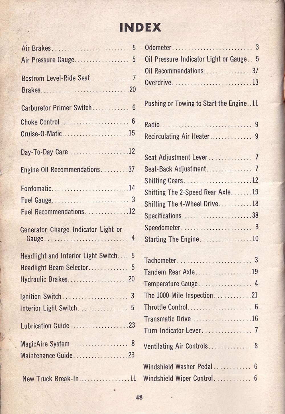 This is an original manual that was issued with 1960 Ford trucks. You will find instructions for operation of the instruments & controls, brakes, choke control, Cruise-O-Matic, Fordomatic, ignition, MagicAire system, overdrive, radio, tandem rear axle, throttle control, Transmatic drive, and ventilating air controls. Also includes specification charts for wheel nut torque, front wheel alignment, engines, tubeless tires, fuel tank capacities, transmission refill capacities, engine crankcase refill capacities, engine cooling system refill capacities, rear axle lubricant capacities, and load capacities. The book has 48 pages of illustrations and step-by-step procedures. Buy now for the best manual for your Ford.