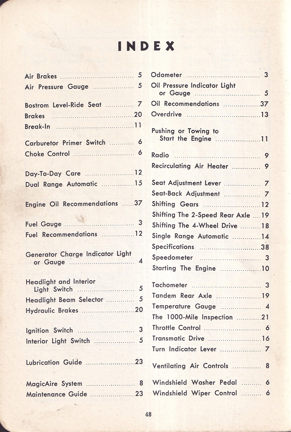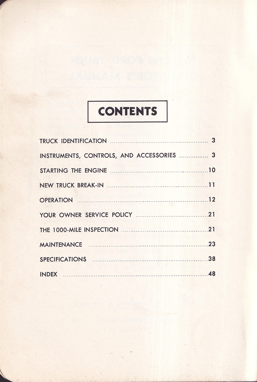 This is an original manual that was issued with 1960 Ford trucks. You will find instructions for operation of the instruments & controls, brakes, choke control, Cruise-O-Matic, Fordomatic, ignition, MagicAire system, overdrive, radio, tandem rear axle, throttle control, Transmatic drive, and ventilating air controls. Also includes specification charts for wheel nut torque, front wheel alignment, engines, tubeless tires, fuel tank capacities, transmission refill capacities, engine crankcase refill capacities, engine cooling system refill capacities, rear axle lubricant capacities, and load capacities. The book has 48 pages of illustrations and step-by-step procedures. Buy now for the best manual for your Ford.