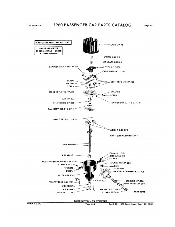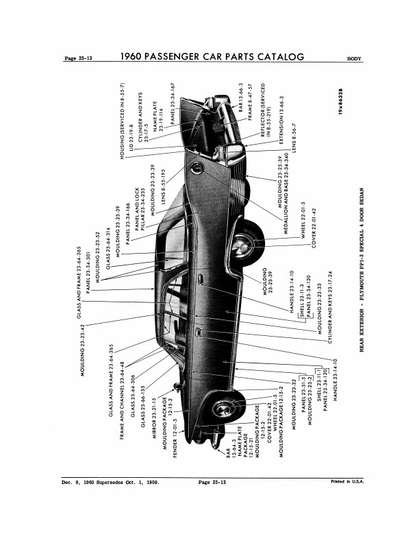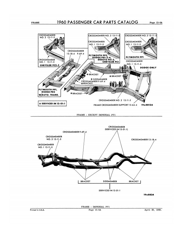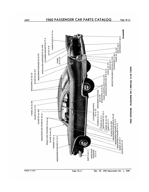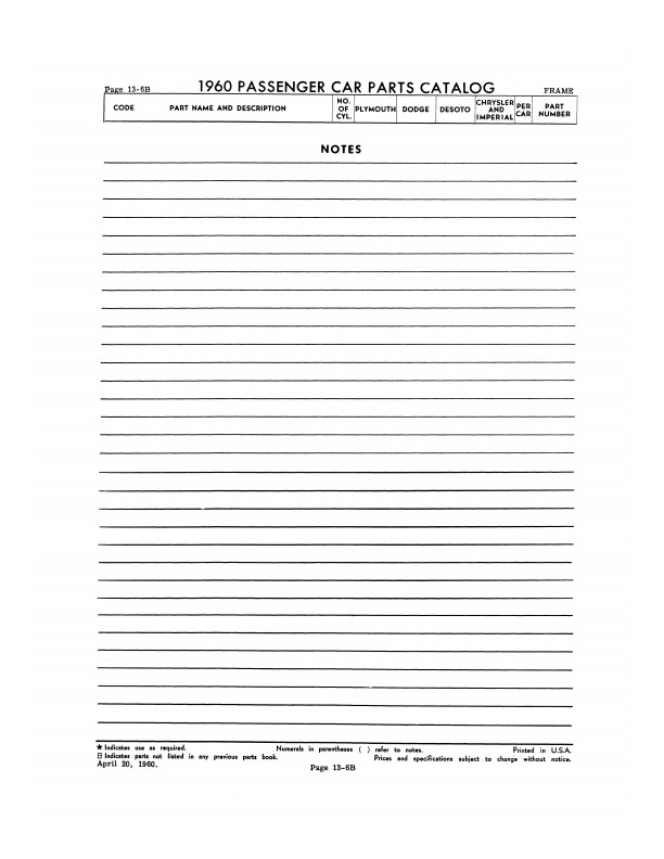 "MoPar Passenger Car Parts Catalog 1960" This reprinted book is your ultimate resource for original part numbers with illustrations for 1960 model Mopar cars. It is a reproduction of the book your dealer would have used to order parts. this book to make your search for parts both quicker and easier. The illustrations in the book will help you to identify parts, and the exploded views can aid you with assembly or disassembly of some parts of the vehicle. In addition to the parts numbers and illustrations, exterior/interior color combinations, trim packages, group & part numbers, and most of the standard hardware (nuts and bolts). You can use this book to help you find parts today because most parts vendors still use Mopar's original part numbers to keep track of their parts. You can also identify if the parts you are buying are original and complete; if you're missing parts, you can use the book to see what you should have. The book has 640 pages, and measures 8" x 11" - NEW condition. Covers 1960 Mopar models including Plymouth, De Soto, Dodge, Chrysler, and Imperial. Buy now to own this useful catalog.