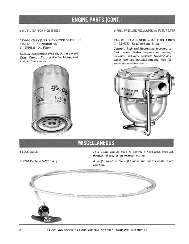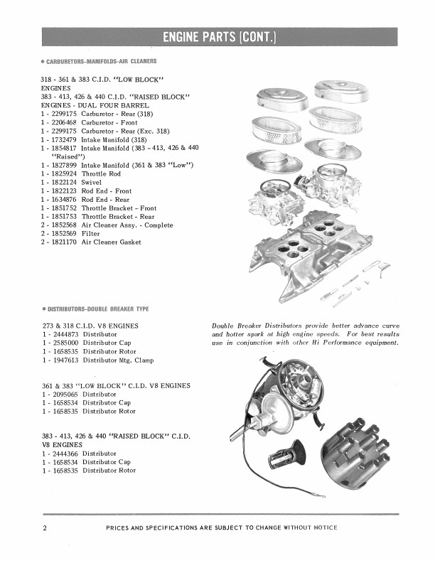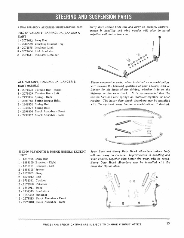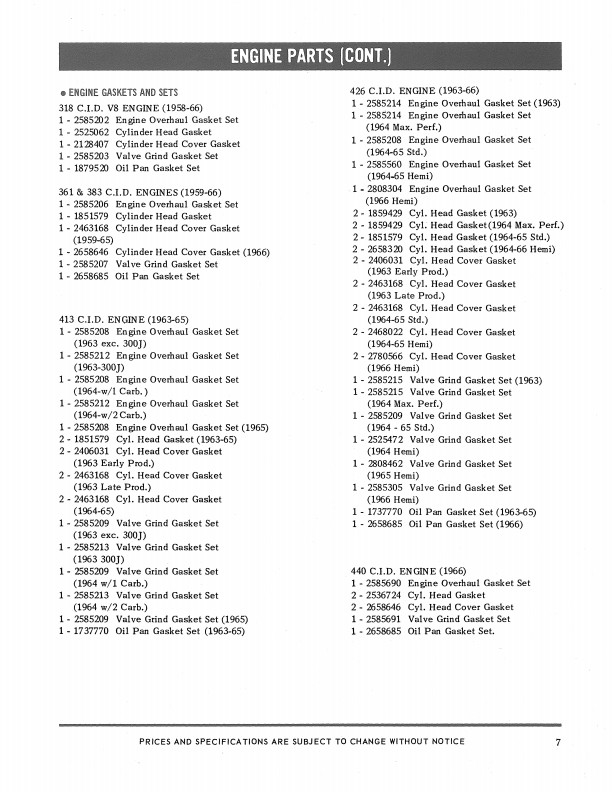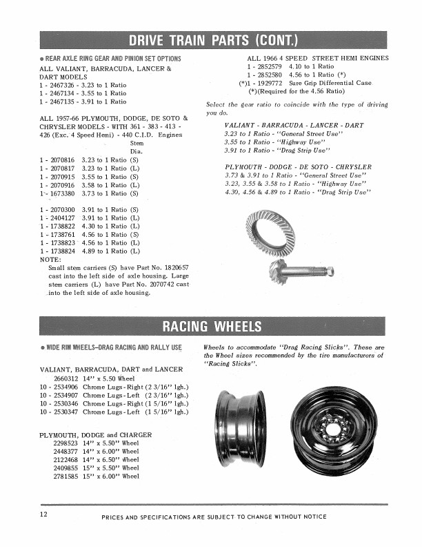 This manual is a reprint of a book written by the Chrysler Parts Department to help their dealers sell performance parts. You will see pictures, part numbers, descriptions, and prices for high performance intake manifold and carburetor options, double-breaker distributors, heavy duty valve springs and push rods, camshafts, exhaust system, engine gasket sets, competition oil fiter, fuel pressure regulator and filter, high capacity clutch, high speed torque convertor, rear axle ring gear and pinion set options, racing wheels to accomodate drag racing slick tires, sway bar, shock absorbers, springs, torsion bars, fast steering conversion, load leveler, spark plugs, spark plug cable sets, cylinder head covers, wheel covers, and seat belt retractor. You'll also see photos of cans of lubricants and car care products. The chassis parts apply mostly to Coronet, Charger, Dart, Barracuda, Satellite, Belvedere, and Barracuda models. However, many of the parts apply to any car with the following engines: 170, 225, 273, 318, 361, 383, 426, and 440, including Fury, Lancer, Monaco, Polara, Chrysler, Imperial, and De Soto models. Not every part is shown for every car. This book has 25 pages and is in new condition. Buy now to find out how to soup up your car and still keep it original MoPar.
