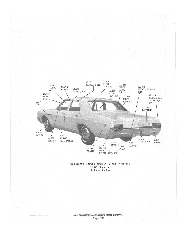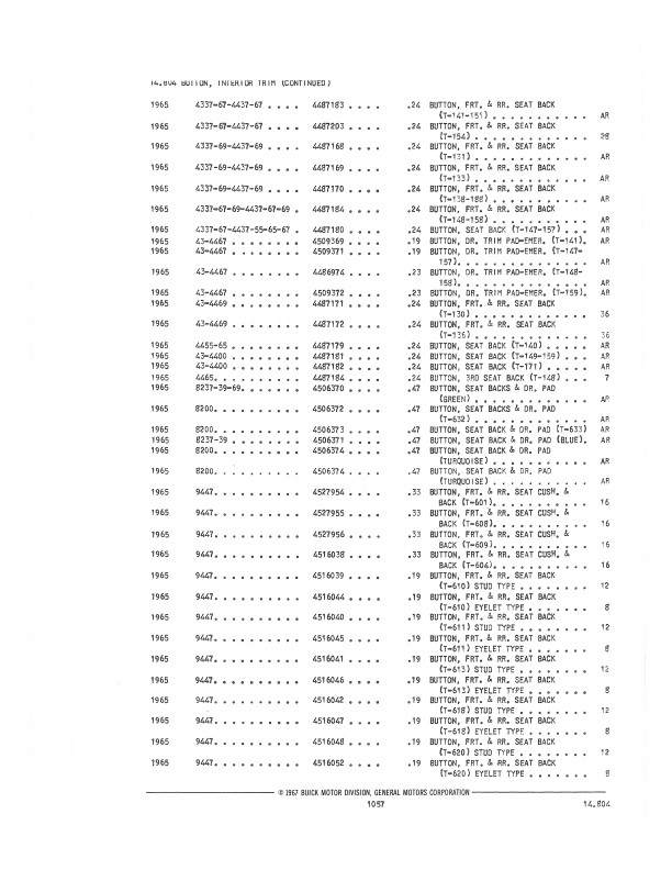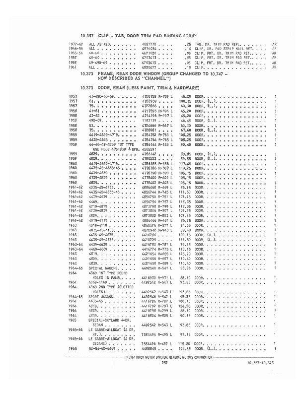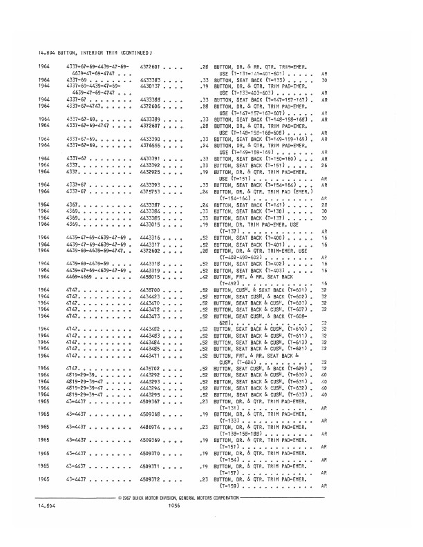 This book includes body and interior parts from the firewall back; a separate mechanical parts book usually covers the front fenders, grill, and dash. This is the book that dealership parts & service departments used to order parts. The illustrations in the book will help you to identify parts, and the exploded views can aid you with the assembly or disassembly of some parts of the vehicle. The text is a list of the parts available at the time of publication with data such as part numbers, model-year application and/or component application, part names, and more.