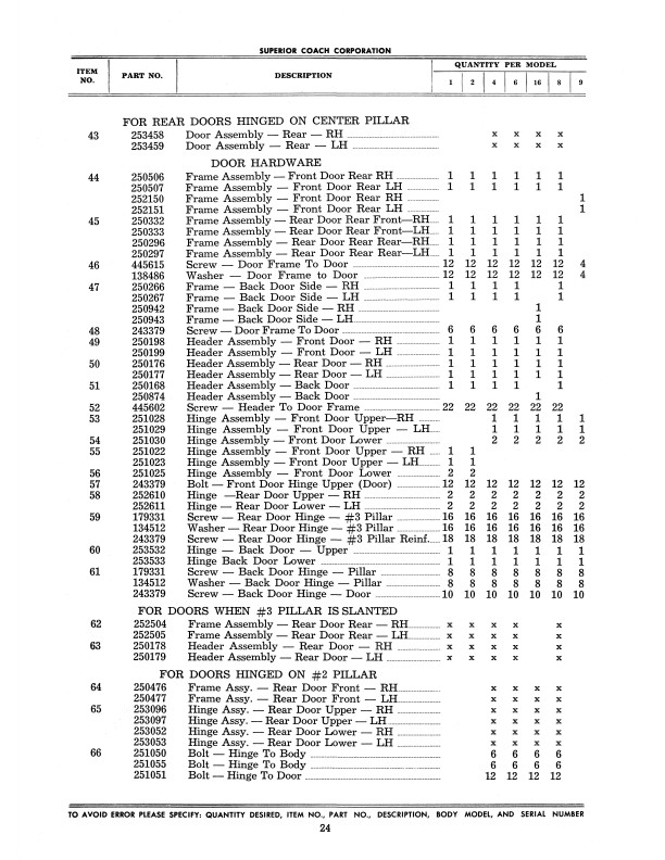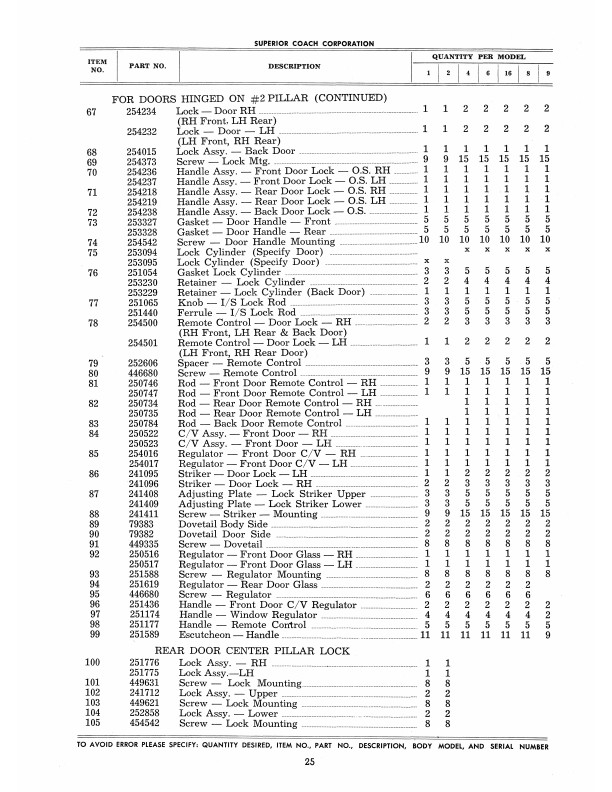 "Superior-Cadillac Parts and Service Manual 1961" This is a quality, authorized reproduction of the manual printed by Superior to order parts for bodies. It shows pictures of parts, along with part numbers and descriptions. You will see a skeleton view of the body pillars, as well as photos of the interior and exterior of the cars. The manual includes parts peculiar to Superior bodies that differ from standard Cadillacs, such as bumpers, pillars, doors, trim, upholstery, roof, drapes, electrical, glass, weather-stripping, hardware, mouldings, partition, locks, rear quarter, and exhaust system. For mechanical parts and body parts that professional cars share with other Cadillacs you will need the Cadillac parts book. Although Superior titled the book "Parts and Service Manual," it appears to be all parts and not to have service instructions. This manual covers all 1961 Cadillac Superior bodies including Hearse (side service, rear loading, Landau), Flower Car, and Ambulance. It includes models 601, 602, 604, 606, 608, 609, and 616. The book measures 8.5" x 11" and has 41 pages. Buy now to own this hard-to-find manual for your car.