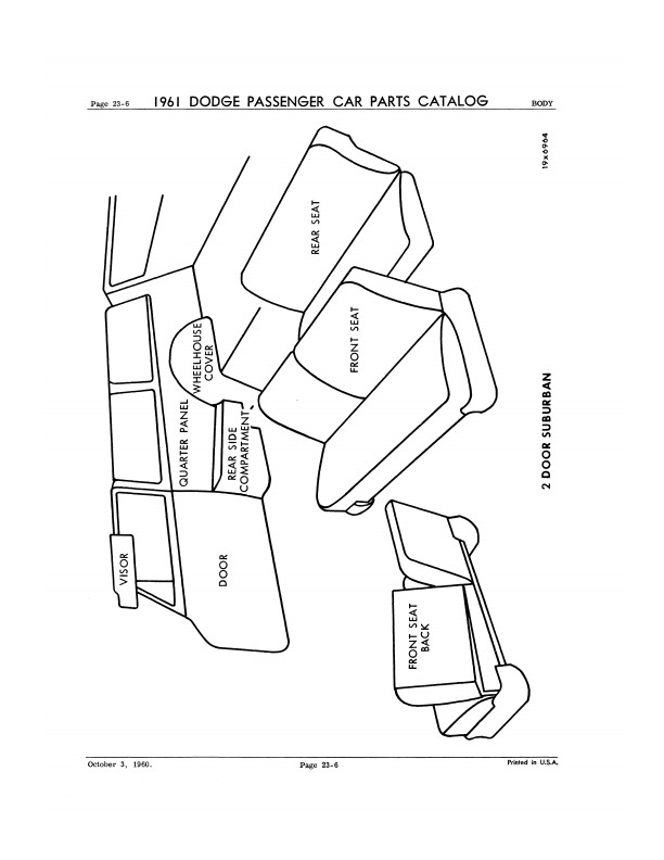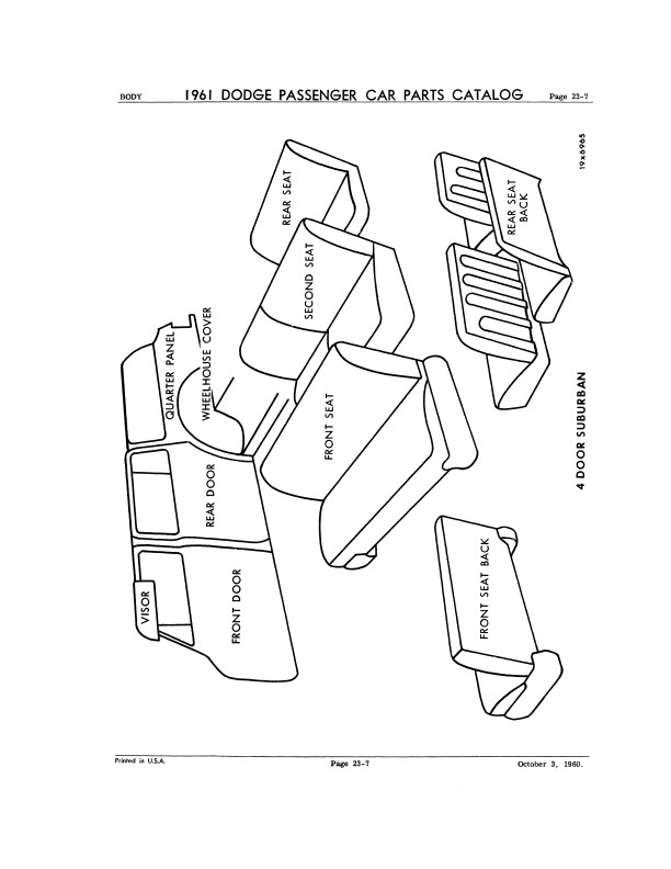 "1961 Dodge Parts Passenger Car Parts Catalog" This reprinted book is your ultimate resource for original part numbers with illustrations for 1961 Dodge cars. It is a reproduction of the book your dealer would have used to order parts. You will find original MoPar part numbers and illustrations. You will also see exploded view illustrations, exterior/interior color combinations, trim packages, group & part numbers, most of the standard hardware (nuts and bolts), and each part's applicable year. You can use this book to help you find parts today because most parts vendors still use Mopar's original part numbers to keep track of their parts. You can also identify if the parts you are buying are original and complete; if you're missing parts, you can use the book to see what you should have. The book has 516 pages and measures 8" x 11" - NEW condition. This manual covers all 1961 Dodge car models including Dart, Seneca, Pioneer, Phoenix, Polara, Lancer, 170, 770, and wagons. Buy now to own this useful catalog.
