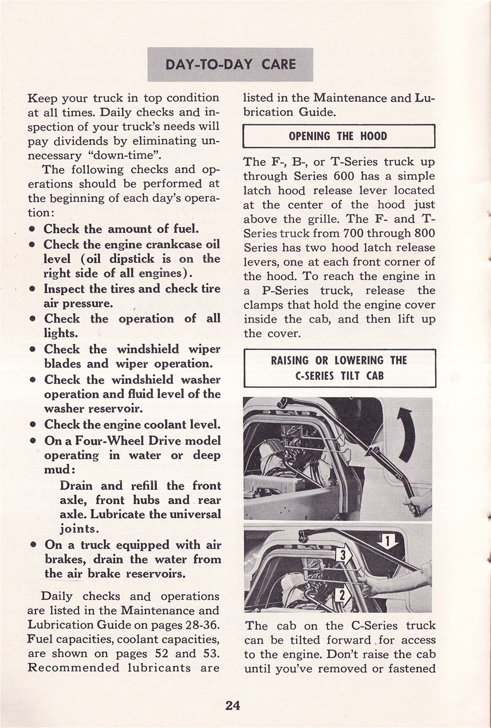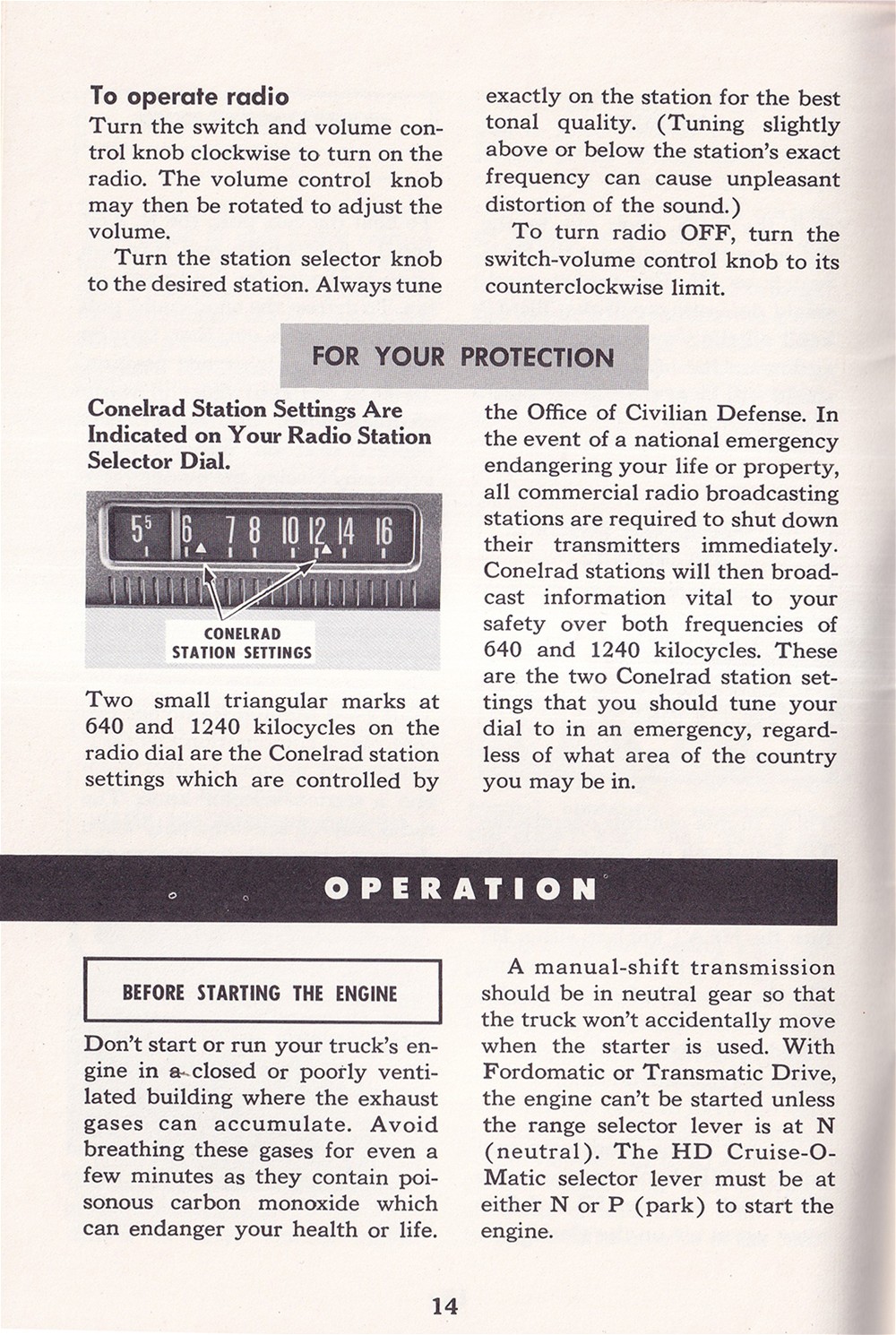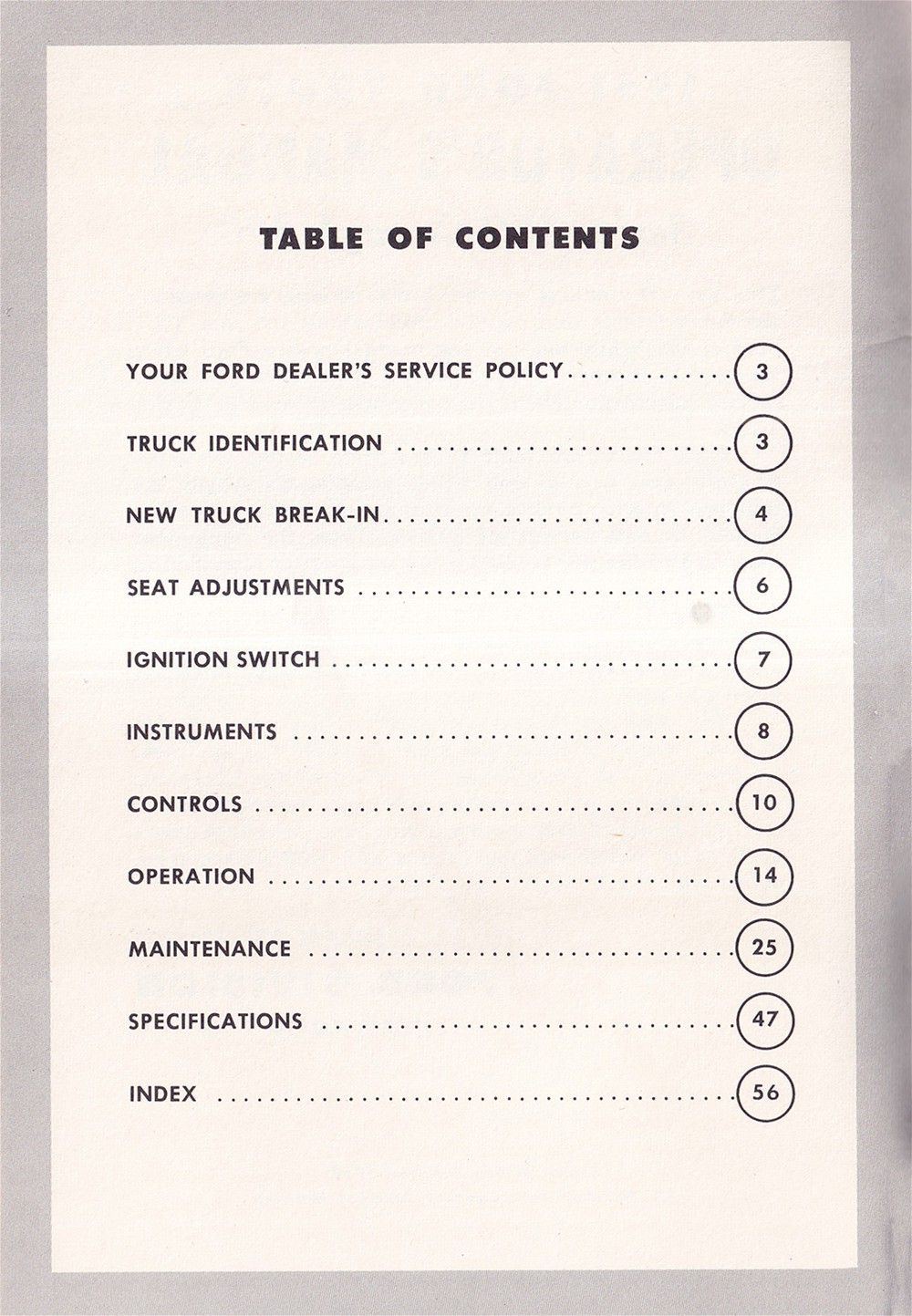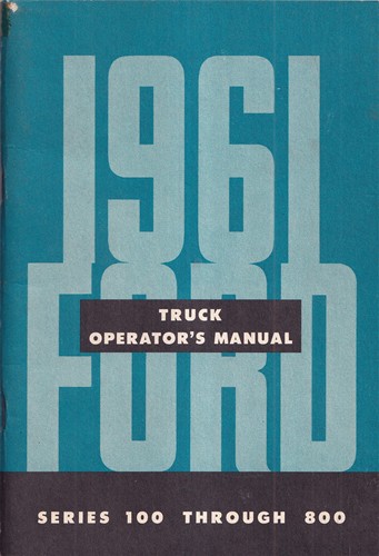 This is an original manual that was issued with 1961 Ford trucks. You will find instructions for operation of the instruments & controls, brakes, choke control, Cruise-O-Matic, Fordomatic, ignition, MagicAire system, overdrive, radio, tandem rear axle, throttle control, Transmatic drive, and ventilating air controls. Also includes specification charts for wheel nut torque, front wheel alignment, engines, tubeless tires, fuel tank capacities, transmission refill capacities, engine crankcase refill capacities, engine cooling system refill capacities, rear axle lubricant capacities, and load capacities. Buy now for the best manual for your Ford.