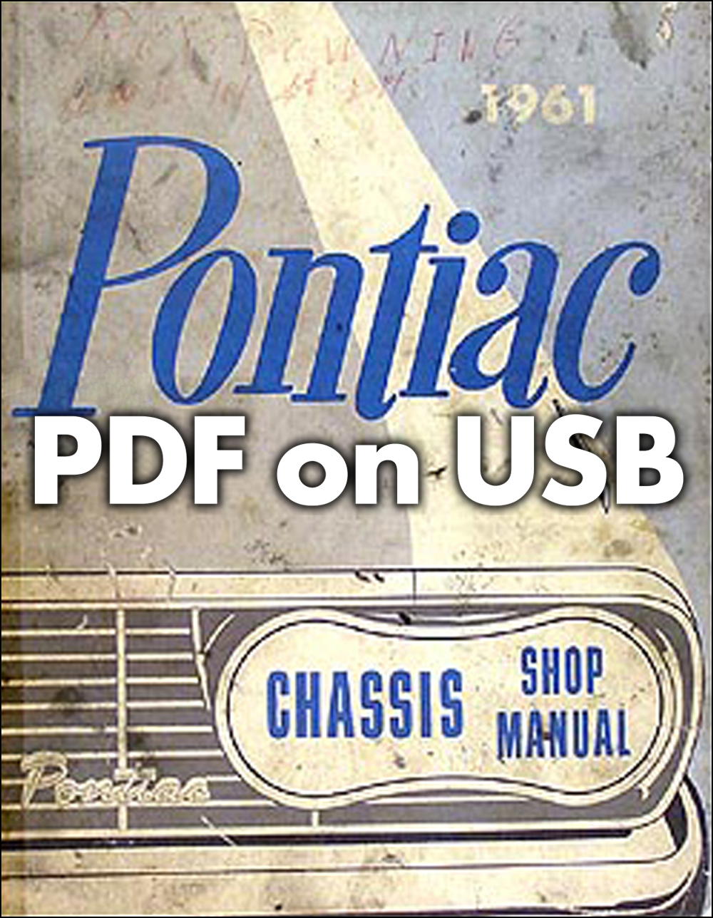 This USB offers page-for-page reproductions of five bound manuals that Pontiac mechanics used to service vehicles. It includes: the 479 page "1961 Pontiac Chassis Shop Manual," the 350+ page "1961 Pontiac Tempest Pontiac Chassis and Body Shop Manual", the 226 page "1961 Heating, Ventilation, and Air Conditioning Shop Manual," the 176 page "1961 Pontiac Hydra-Matic Shop Manual," and the 158 page "1961 Pontiac Body Manual."