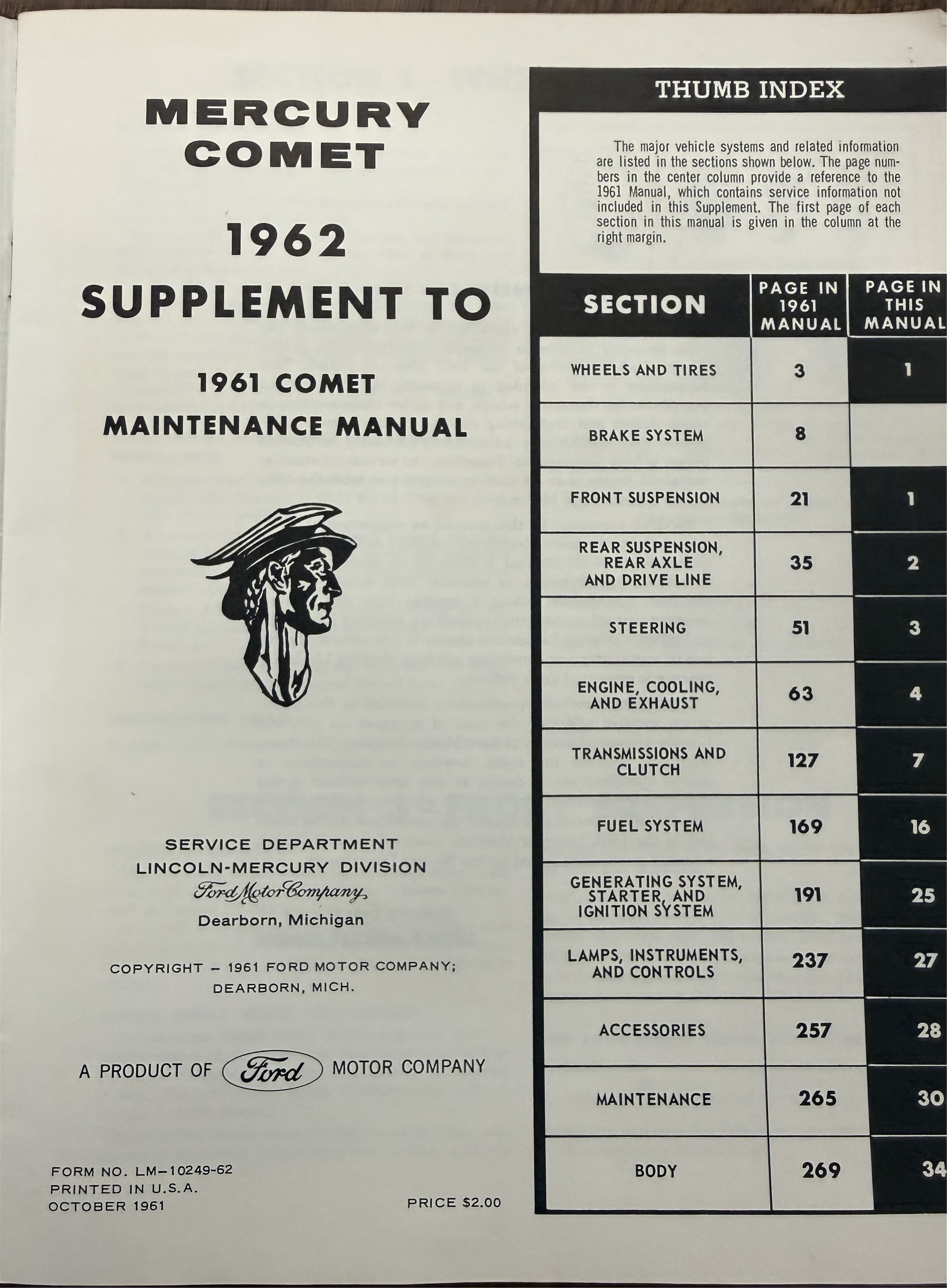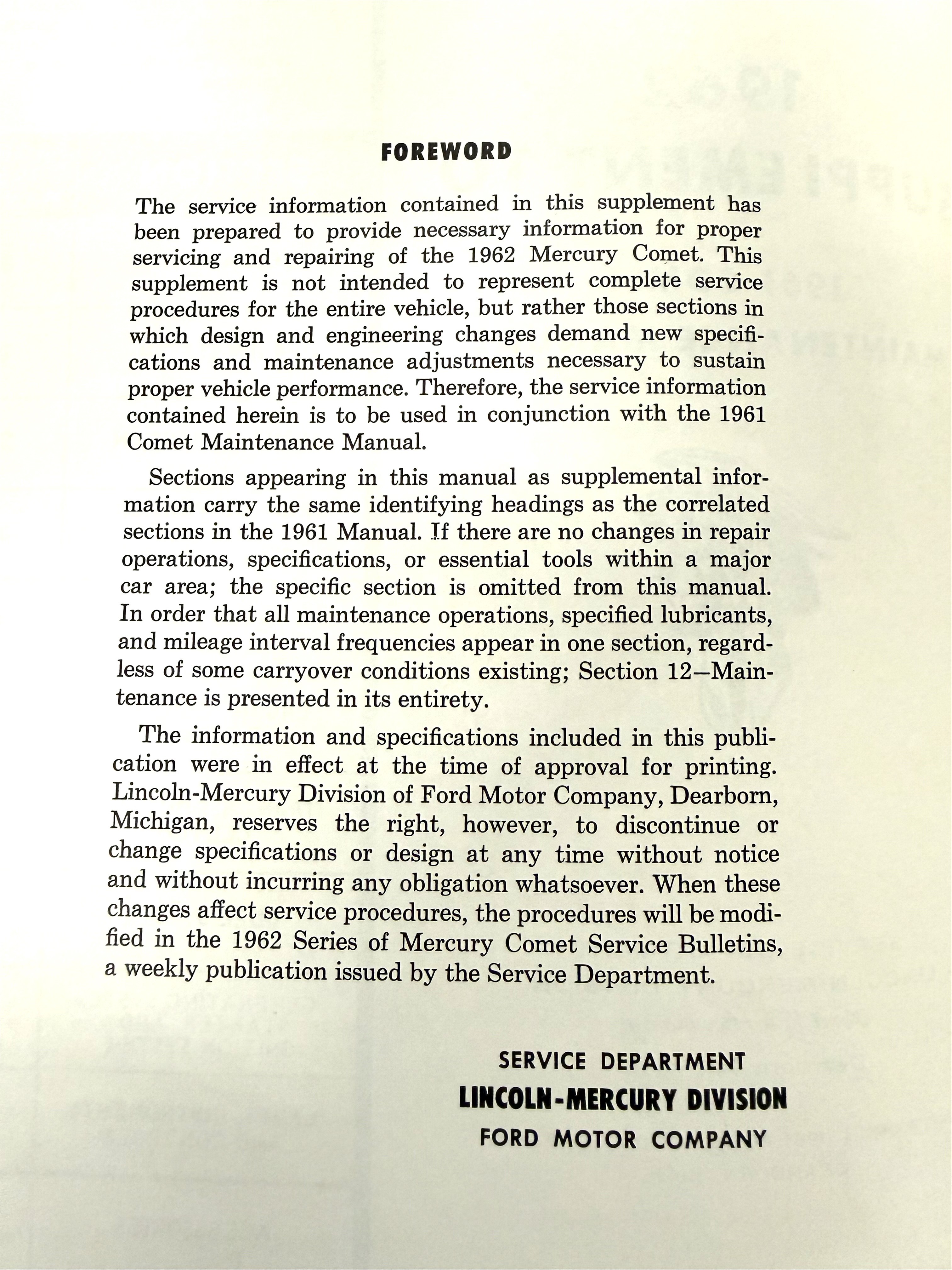 "Mercury Comet 1962 Supplement to 1961 Maintenance Manual"