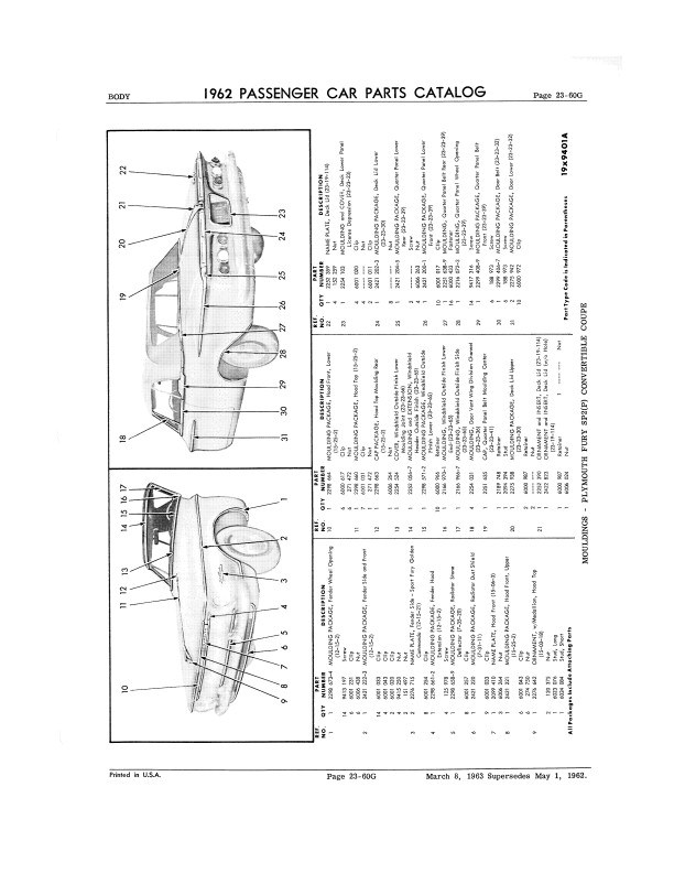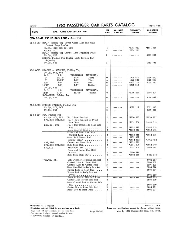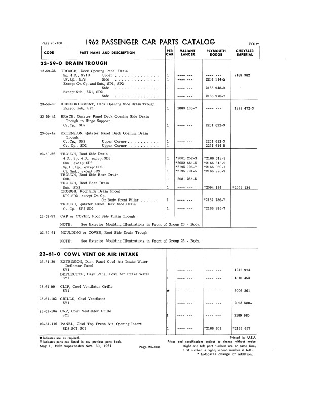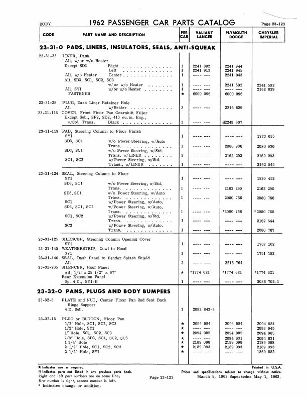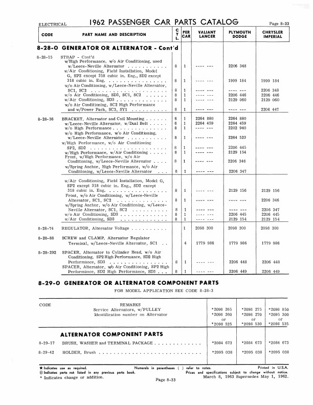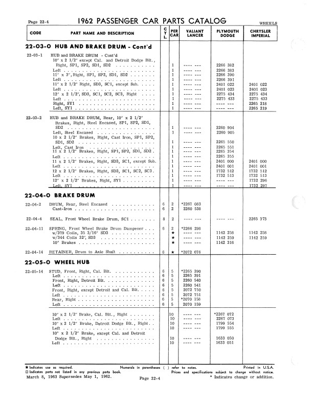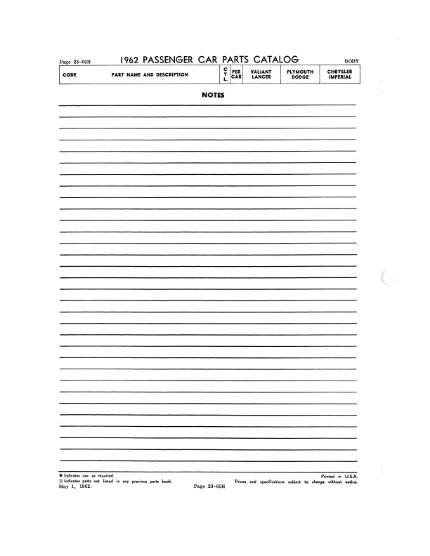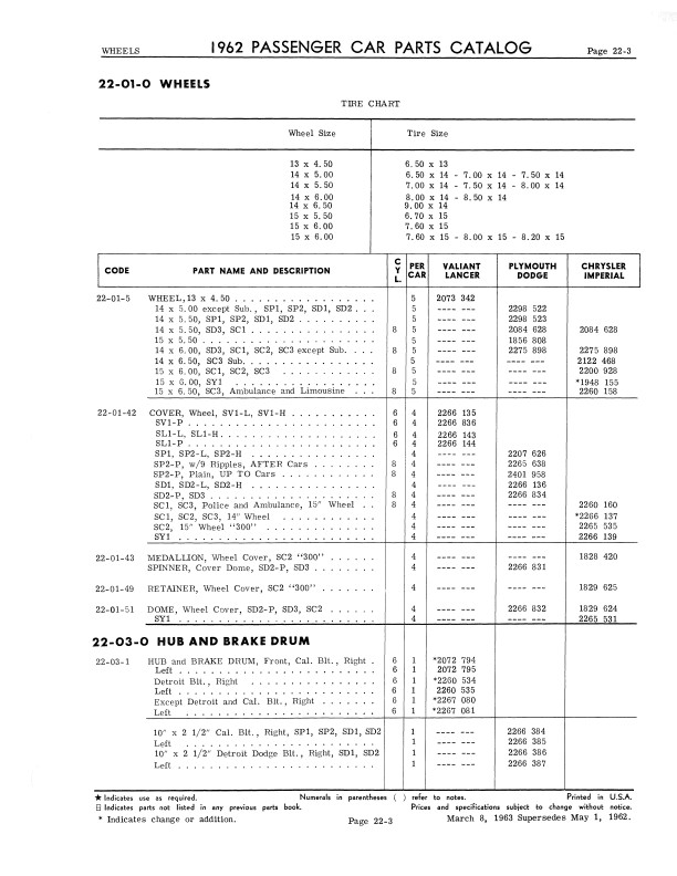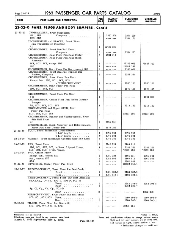 "1962 Chrysler Parts Passenger Car Parts Catalog" 2 Volume Set .This reprinted book is your ultimate resource for original part numbers with illustrations for 1962 model Mopar cars. It is a reproduction of the book your dealer would have used to order parts. You will find original MoPar part numbers and illustrations. You will also see exploded view illustrations, exterior/interior color combinations, trim packages, group & part numbers, and most of the standard hardware (nuts and bolts). You can use this book to help you find parts today because most parts vendors still use Mopar's original part numbers to keep track of their parts. You can also identify if the parts you are buying are original and complete; if you're missing parts, you can use the book to see what you should have. The book set has 1068 pages, and measures 8" x 11" - NEW condition. Covers 1962 Mopar models including Plymouth, Dodge, Chrysler, and Imperial. Buy now to own this useful catalog.