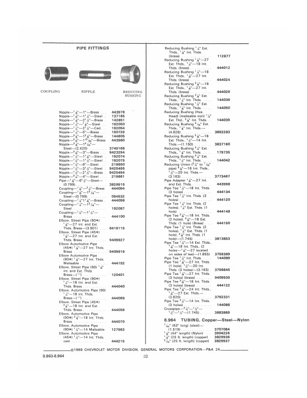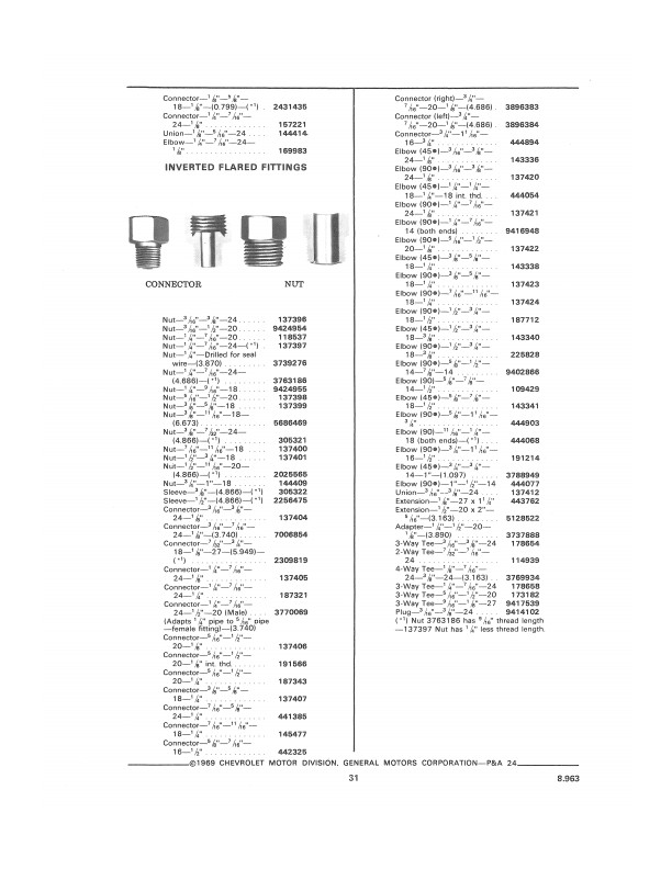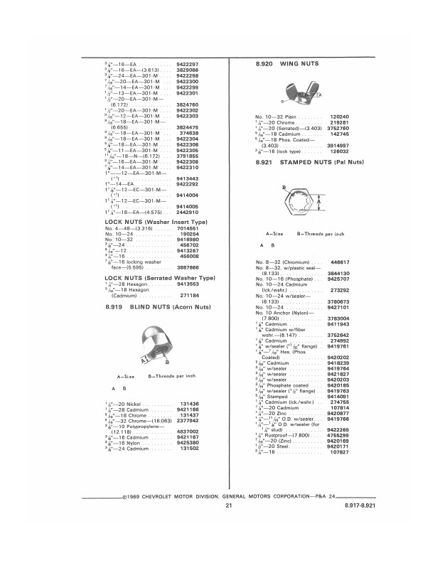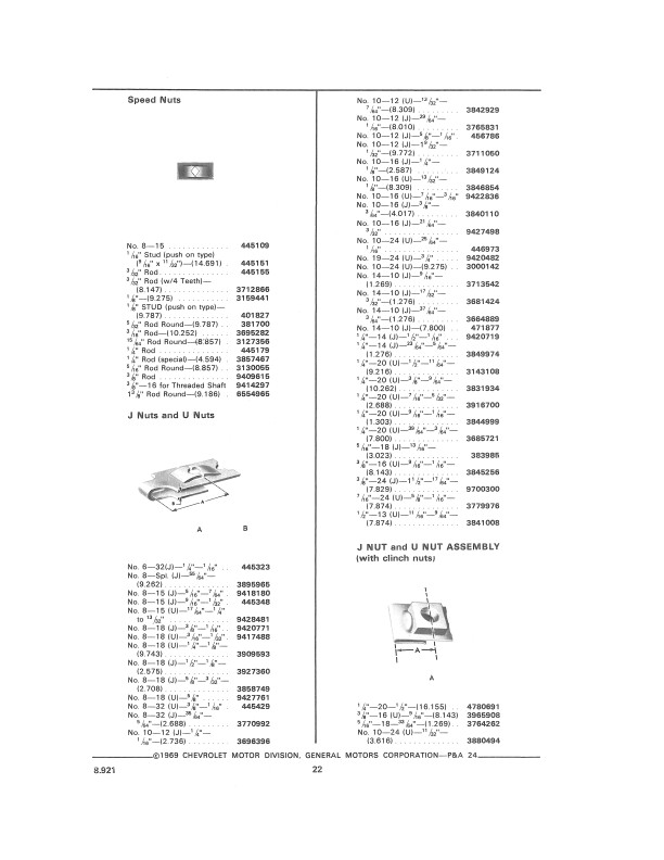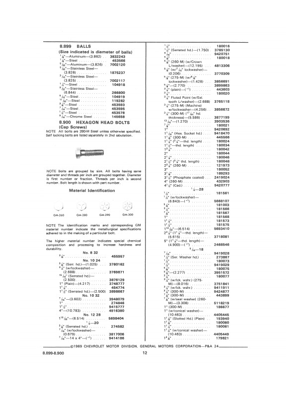 This reprint of a Chevrolet publication is your ultimate resource for finding original automotive hardware. Make your vehichle original down to the last nut & bolt. You will find standard hardware parts such as bolts, screws, springs, nuts, washers, clips, retainers, pins, drain cocks, fittings, plugs, tees, couplings, adapters, rivets, elbows, steel and aluminumb balls, fuses, bulbs, and electrical connectors (terminals, and sockets).  See drawings of Chevy's original parts along with original part numbers - some parts have additional details, such as length, thread size, thread style, screw size, finish, or material. If you have a parts book for your Chevy, you'll find references to hardware mostly in the 8.9XX groups. This book has those groups in it. Buy now for this hard-to-find reference from Chevrolet.